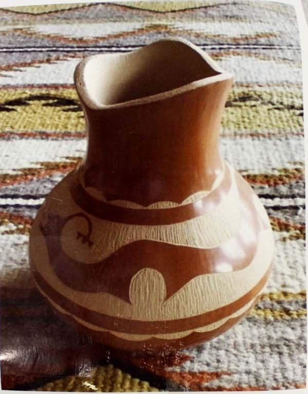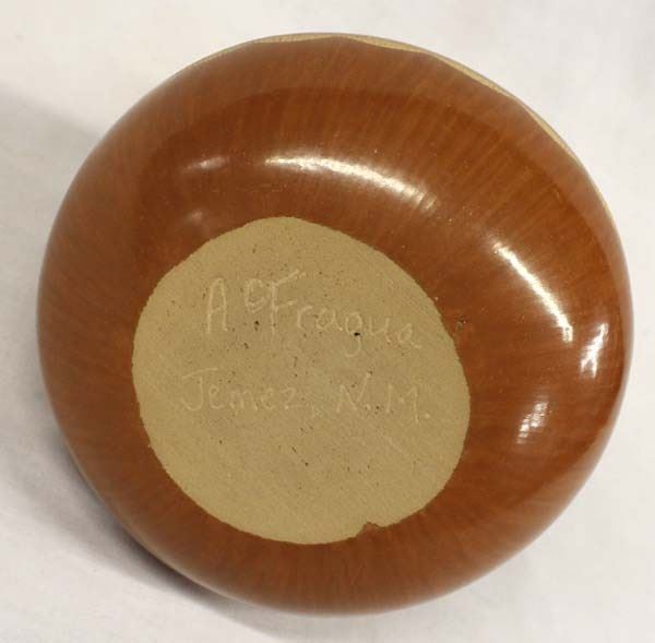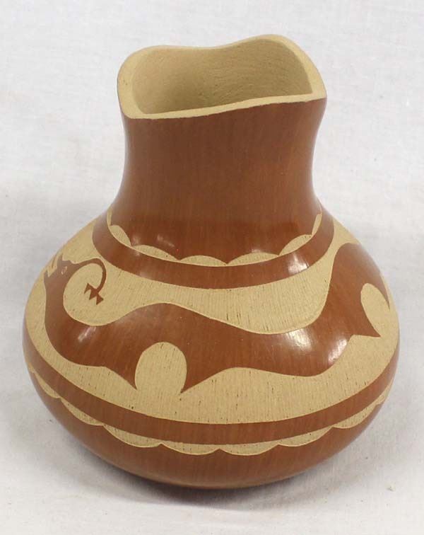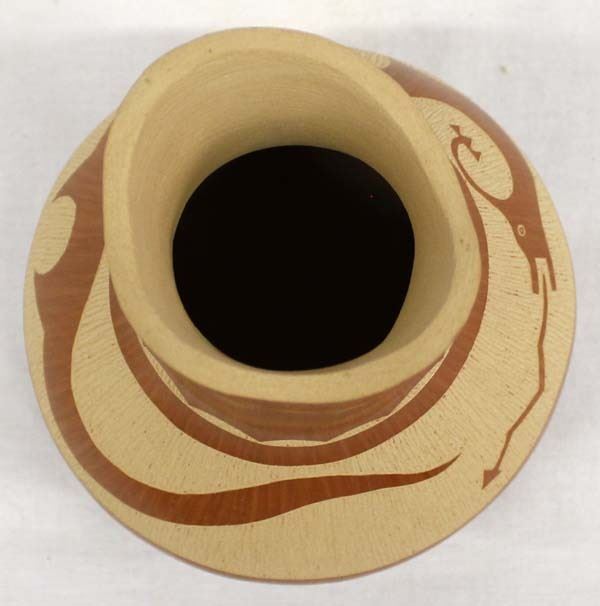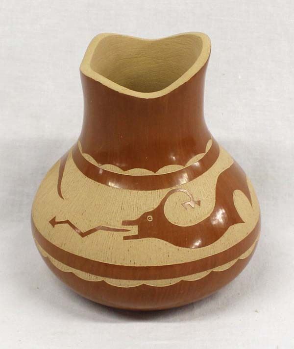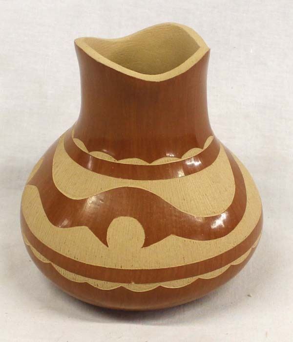 Beautiful Native American Jemez Avanyu Carved Pottery Jar by Anita Fragua, measures 6'' x 5'' and is signed on the bottom, ruffled rim, gorgeous carved avanyu, lines, and designs, phenomenal piece