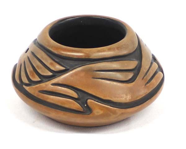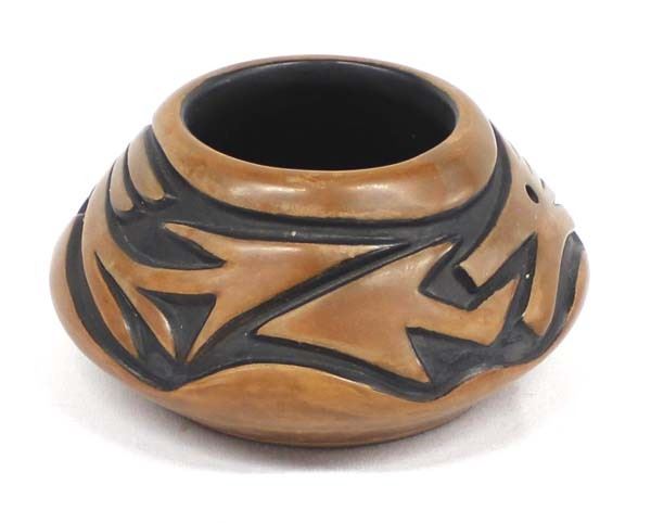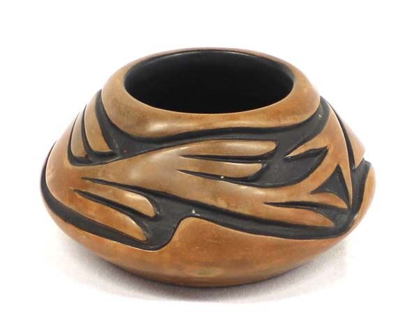 Native American Jemez Deeply Carved Avanyu Redware Pottery Bowl by Carol Grace Loretto, measures 4''H x 7''D and has artist's initials Cg on the bottom, FYI: ''Carol Grace Loreto is a potter in The Jemez Pueblo in New Mexico. While she creates most of her recent work in 'Storytellers', her earlier work showed a more primitive look and feel. This Avanyu ( Water Serpent ) bowl is dark and heavy.''