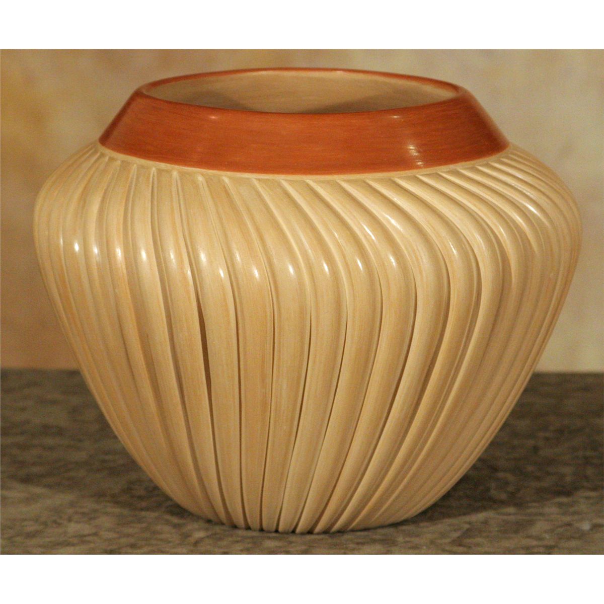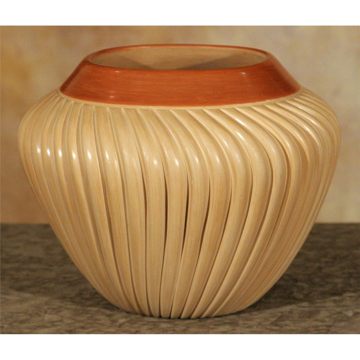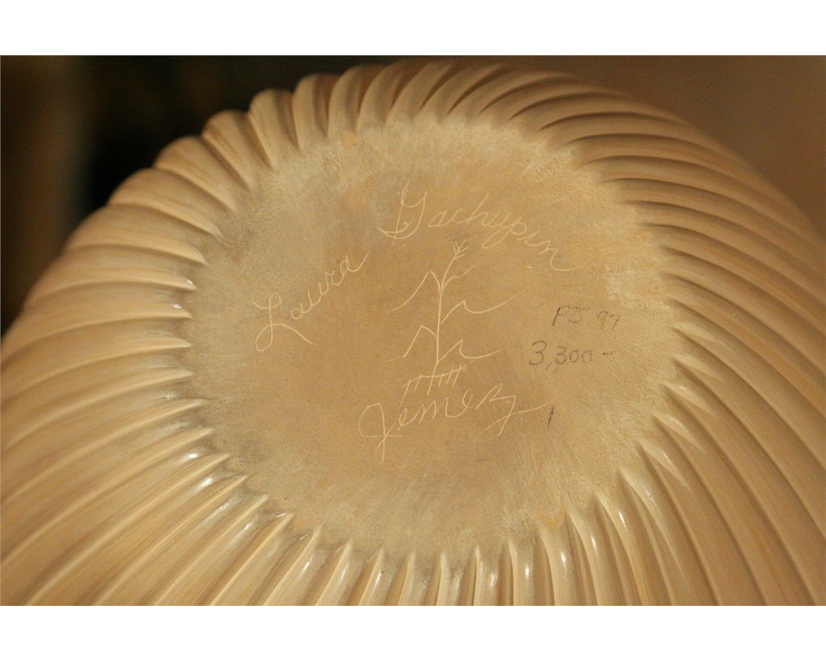 Jemez Melon Pot by Laura Gachupin (1954 - ). 9"x 12". Red and buff ribbed melon-style pot. As fine as they come. Inscribed: Laura Gachupin, Jemez with a cornstalk.