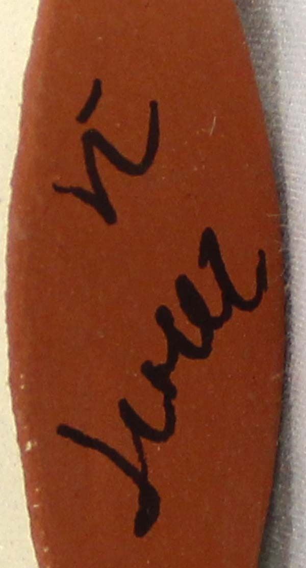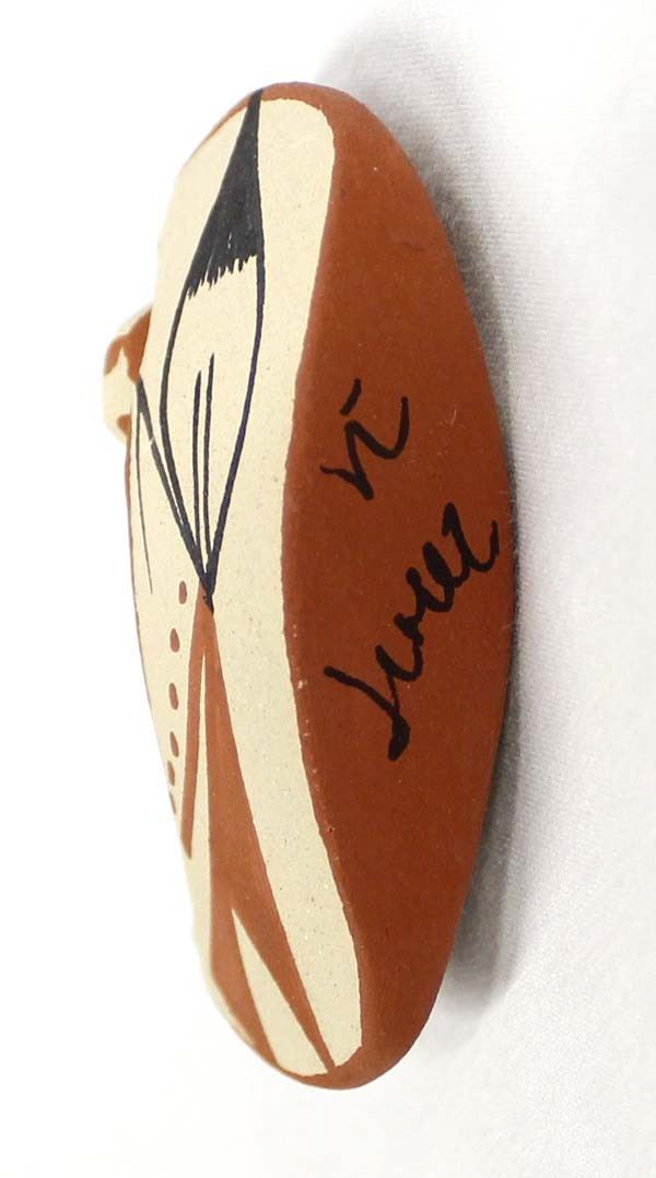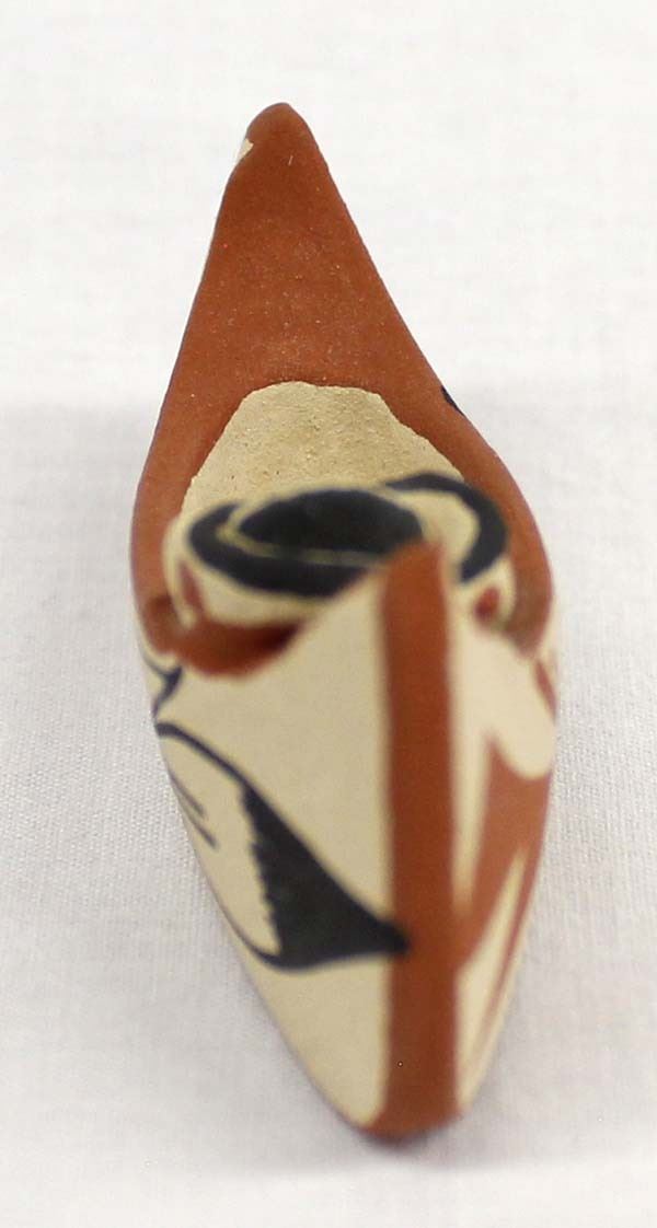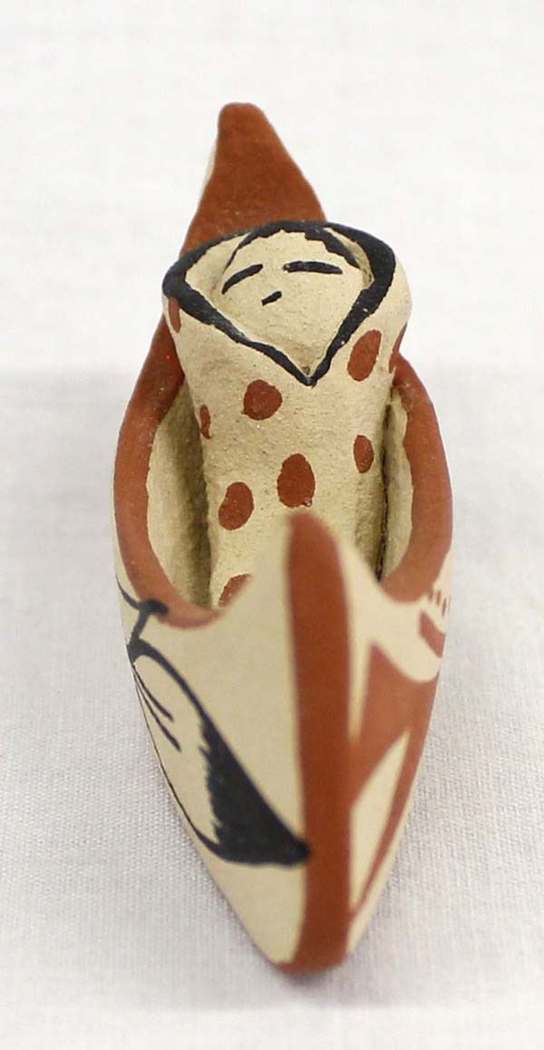 Native American Jemez Miniature Pottery Canoe with Child Aboard by Virginia Chinana, measures 2.5'' x .5'' x 1''L and has artist's initials on bottom, polychrome