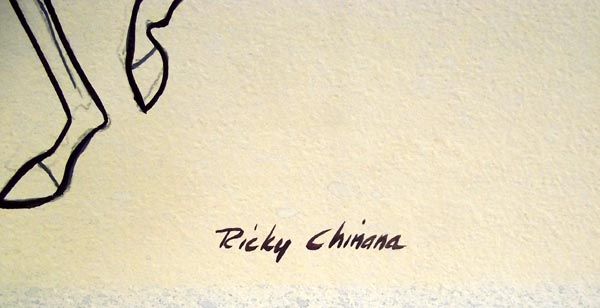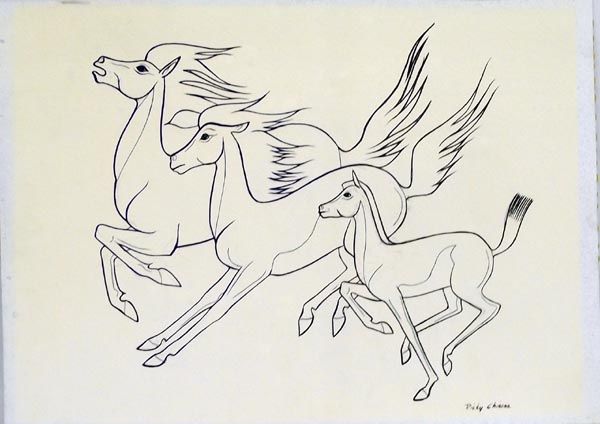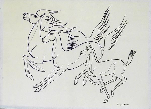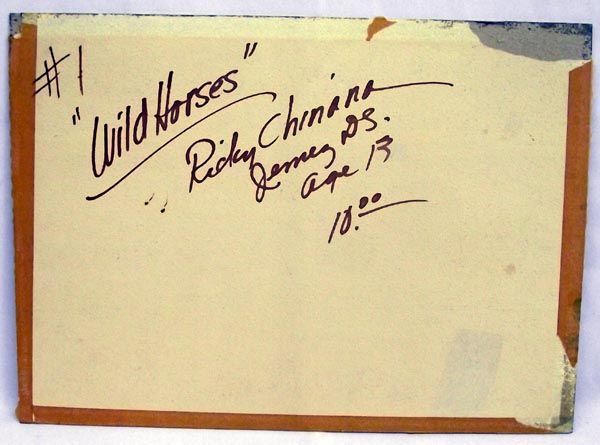 Jemez Original Painting ''Wild Horses'' - Ricky Chinana, 20'' x 14'', signed on back ''#1 Wild Horses Ricky Chinana Jemez Age 13, depicts 2 horses and 1 foal running freely, signed in lower right hand corner, mostly monochromatic