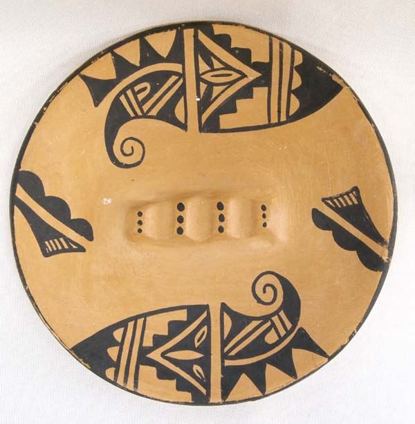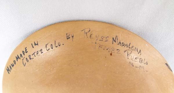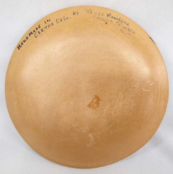 Native American Jemez Parrot Shallow Bowl by Reyes Madalena, measures 6''D x .5''H, bottom of pot is signed ''Handmade in Cortez, Colo. by Reyes Madalena Jemez Peublo N.M.'', exquisite designs