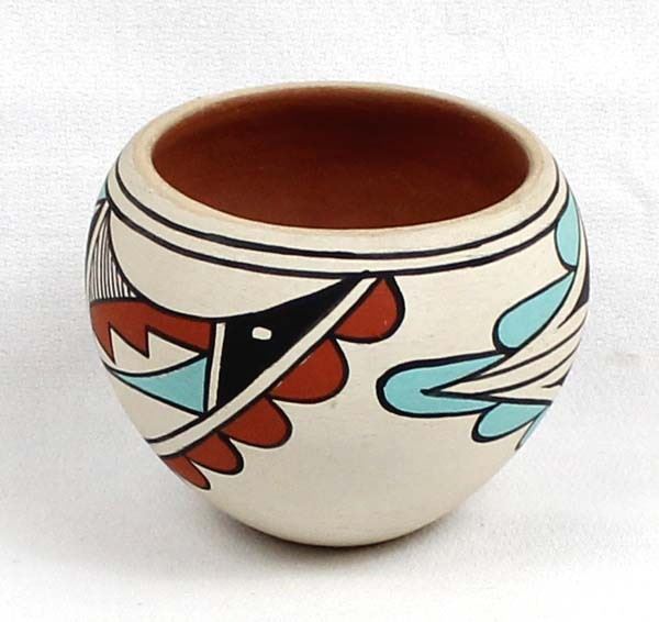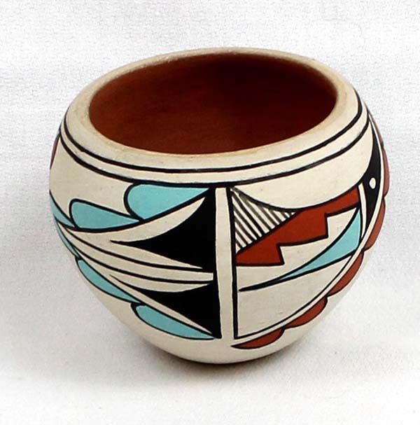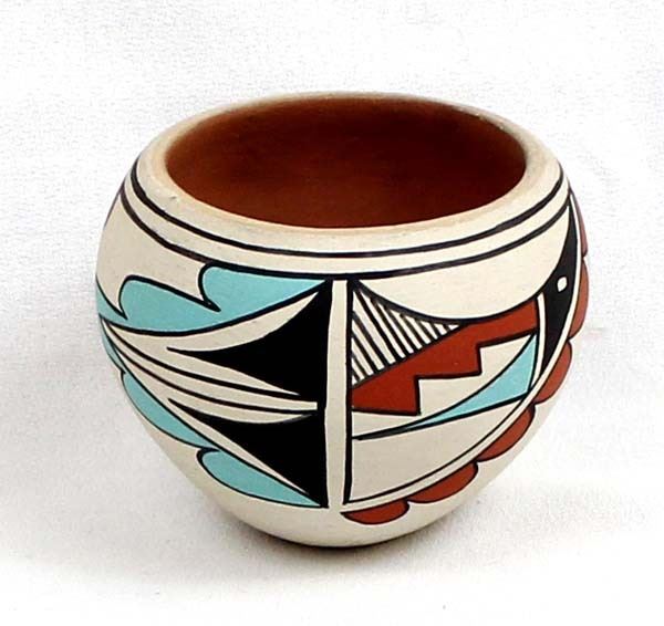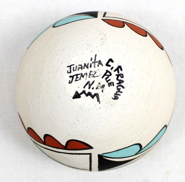 Native American Jemez Polychrome Pottery Bowl by Juanita C. Fragua, measures 3'' x 3'' and is signed on the bottom