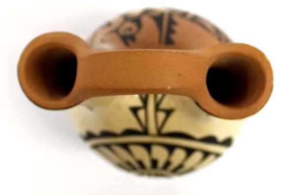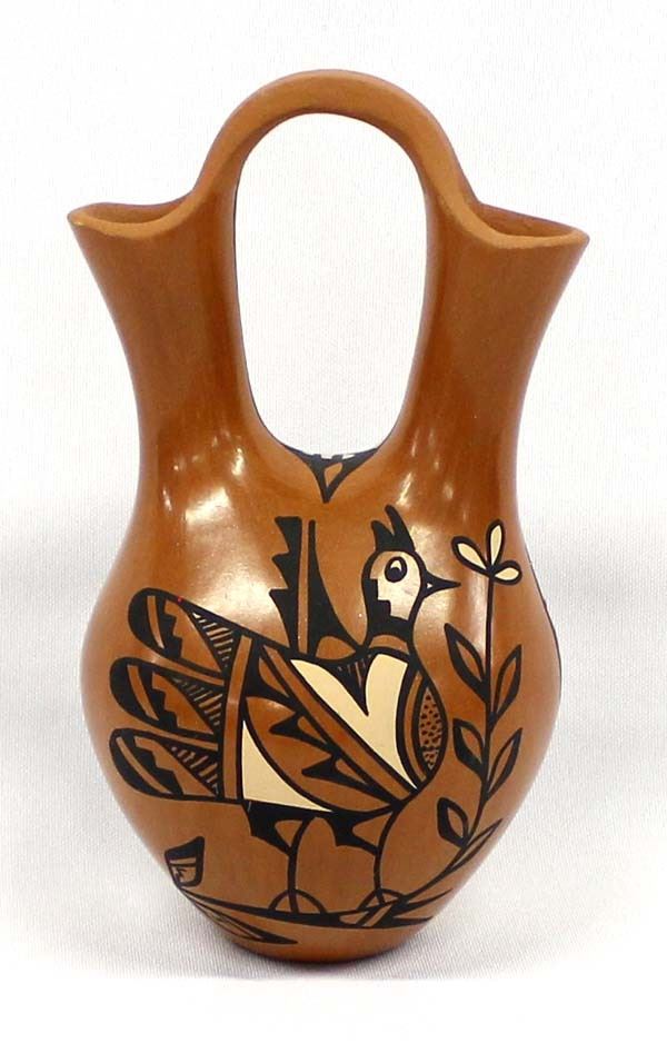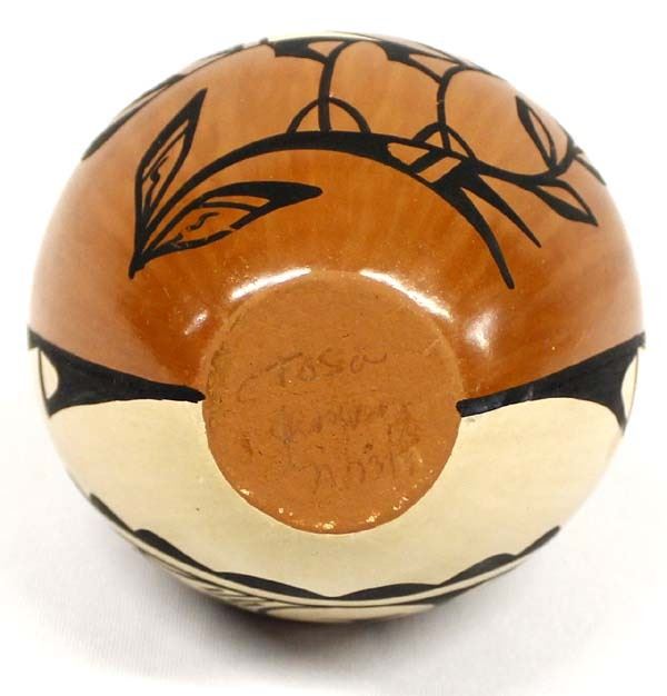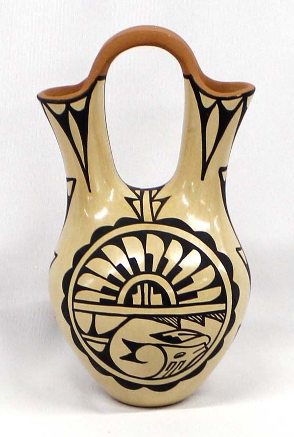 Stunning Native American Jemez Polychrome Pottery Wedding Vase by Christine Tosa, measures 7'' x 4'' and is signed on the bottom, FYI: ''Christine R. Tosa was born in 1950 into the Jemez Pueblo. She began experimenting with pottery making at the age of 12. Christine specializes in handmade Jemez Pueblo, polished pottery. All of her pottery comes from Mother Earth, from start to finish. She digs up her own clay, mixes, shapes, paints and fires her pottery, the traditional way, outdoors. She paints birds, serpents, feathers, and other traditional designs on her pottery. 'I always start out making bowls, and before I know it, I have a wedding vase.' Wedding vases are extremely challenging to make and she welcomes the challenge. Christine signs her pottery as: C. Tosa, Jemez, Walatowa.''