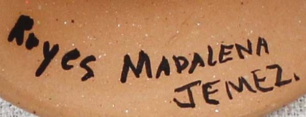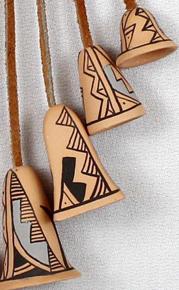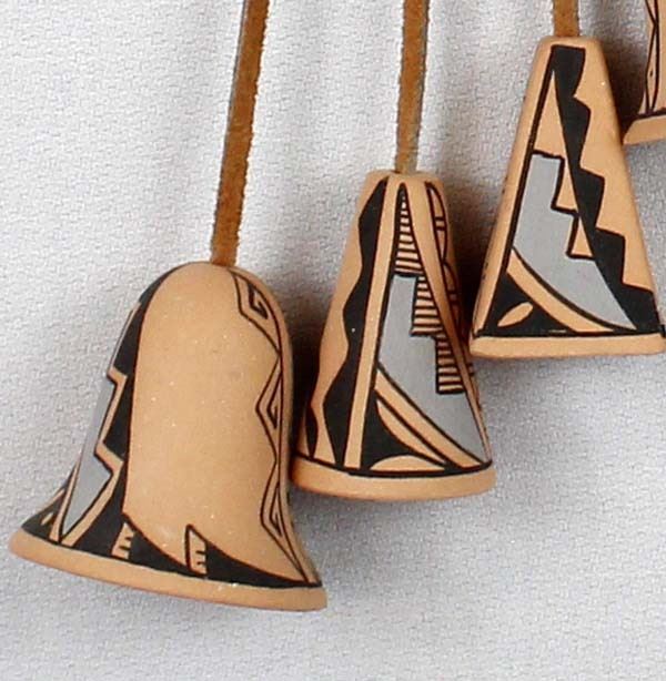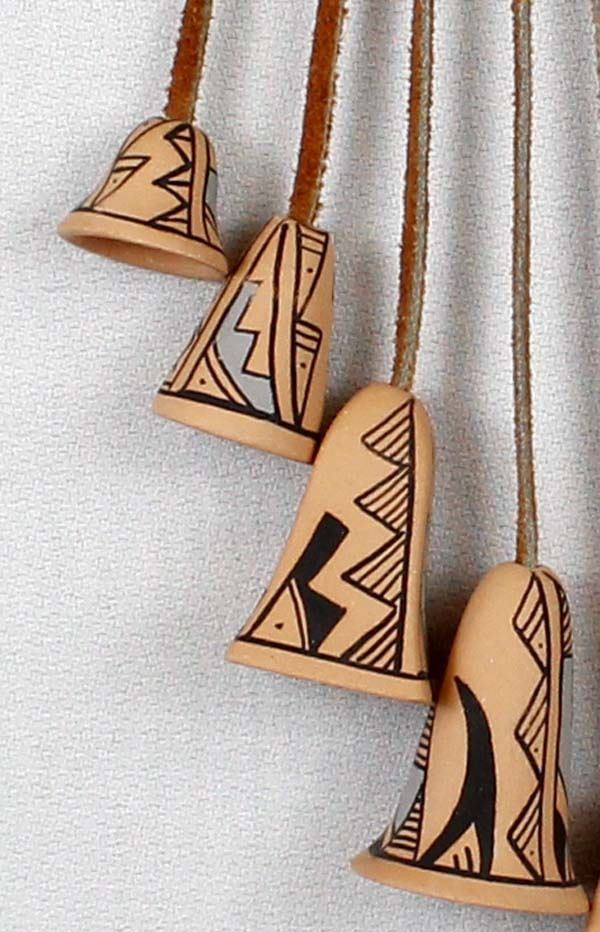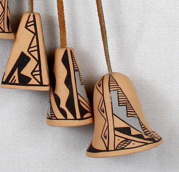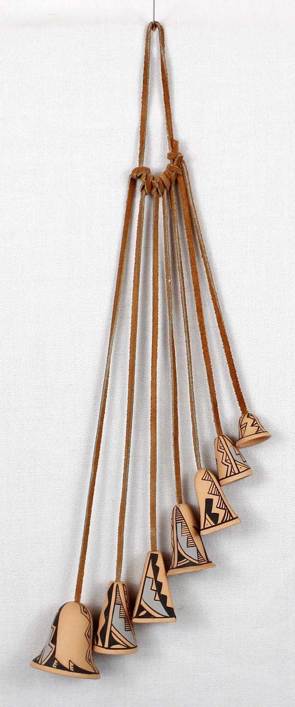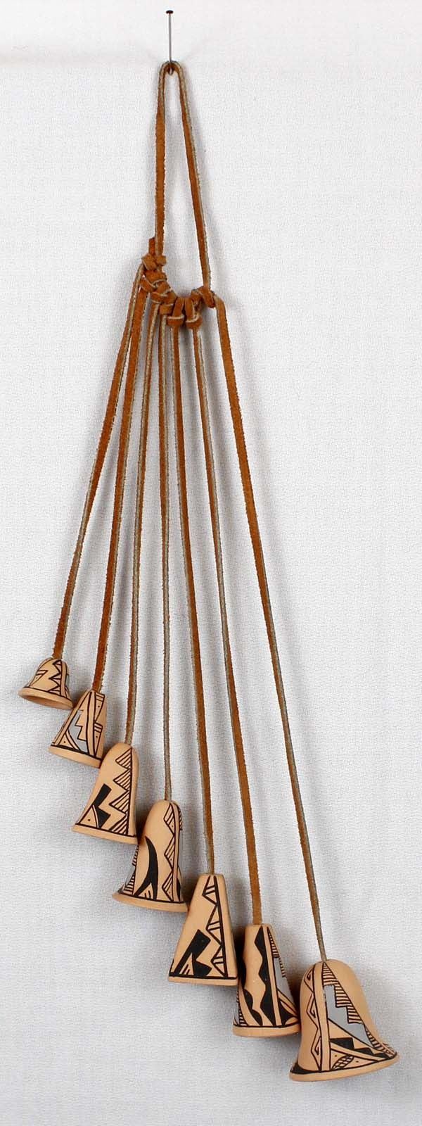 Native American Jemez Pottery Bell Chimes by Reyes Madalena, largest bell measures 1.5'' x 2'' and 12''L, strung on leather and largest bell is signed, beautiful piece