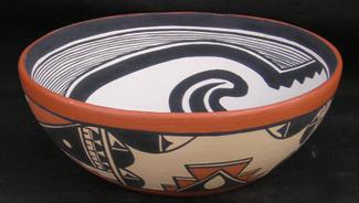 Mimbres design pottery bowl, signed VJT, Jemez Pueblo. 3" x 7-1/2"