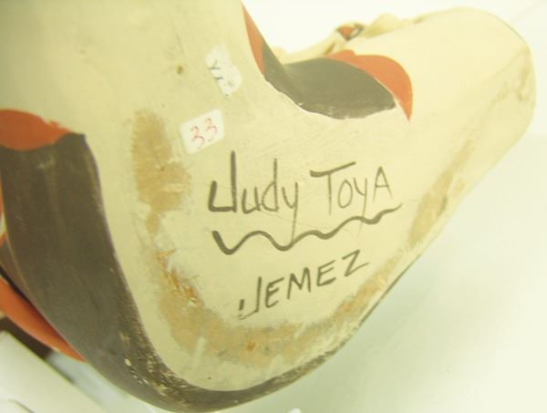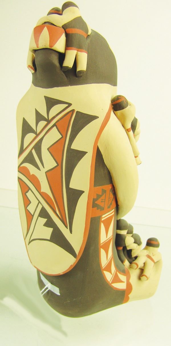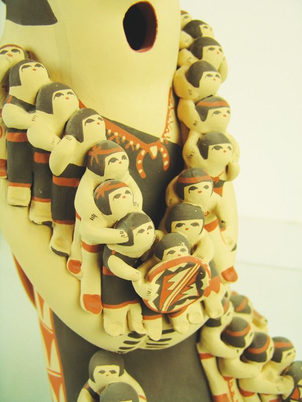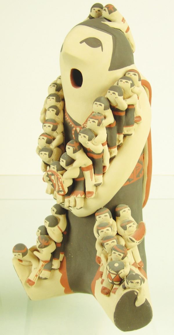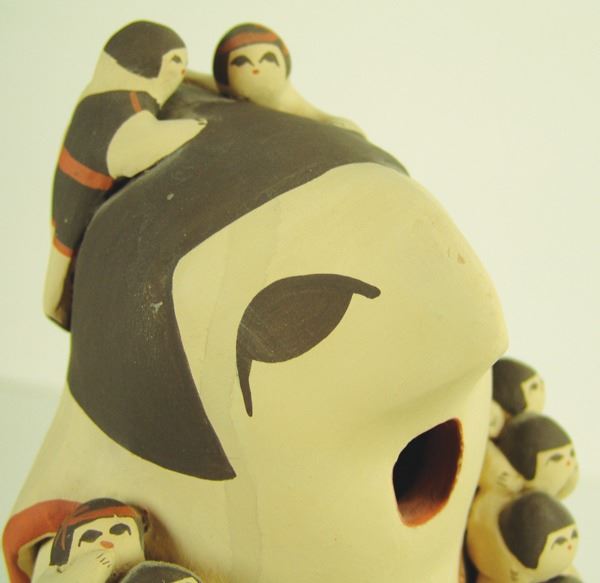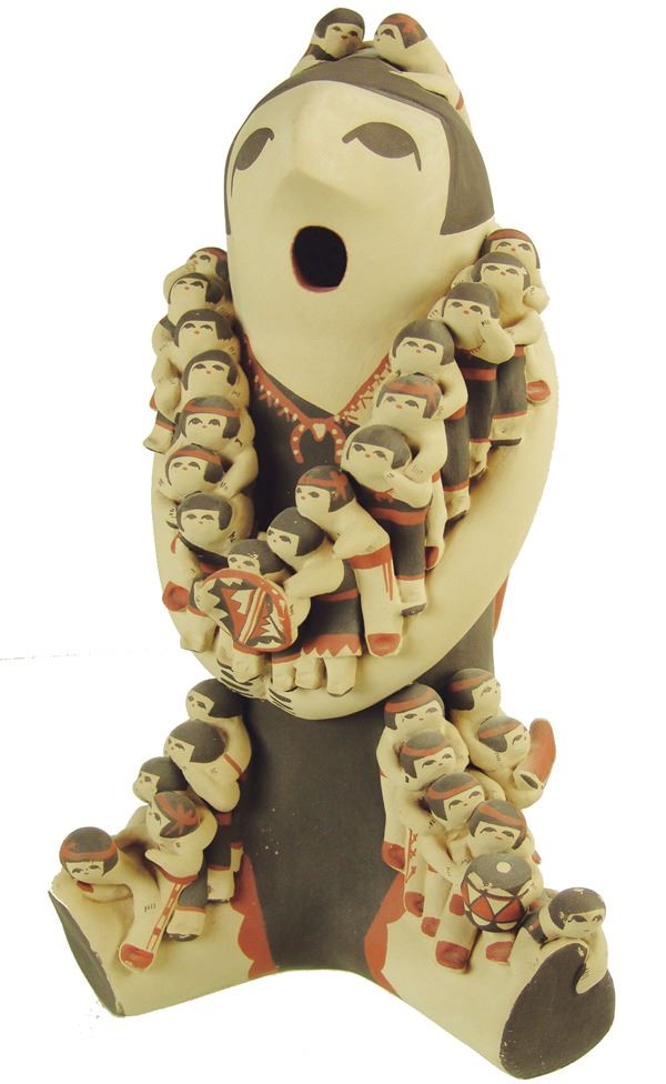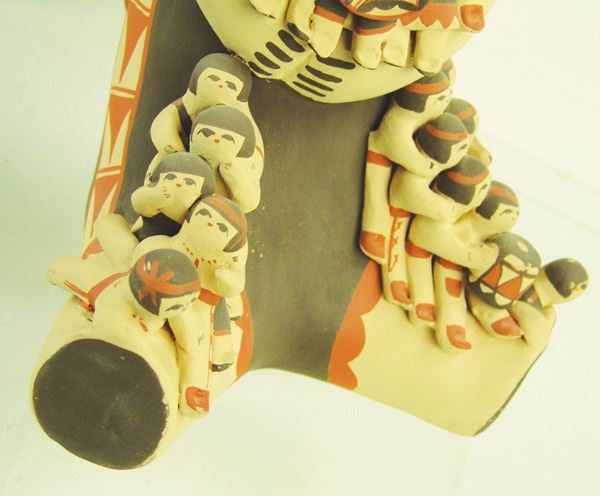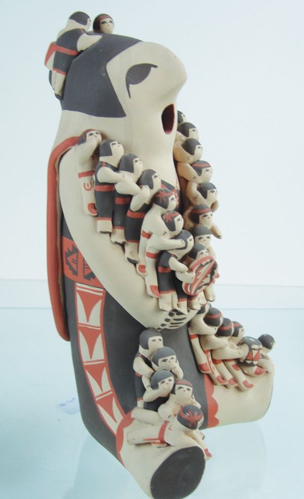 Large and impressive, polychrome pottery "storyteller" figure, the male teller laden with 31, listening children. Very good condition, with a few scuffs.Ca. 1980s17"