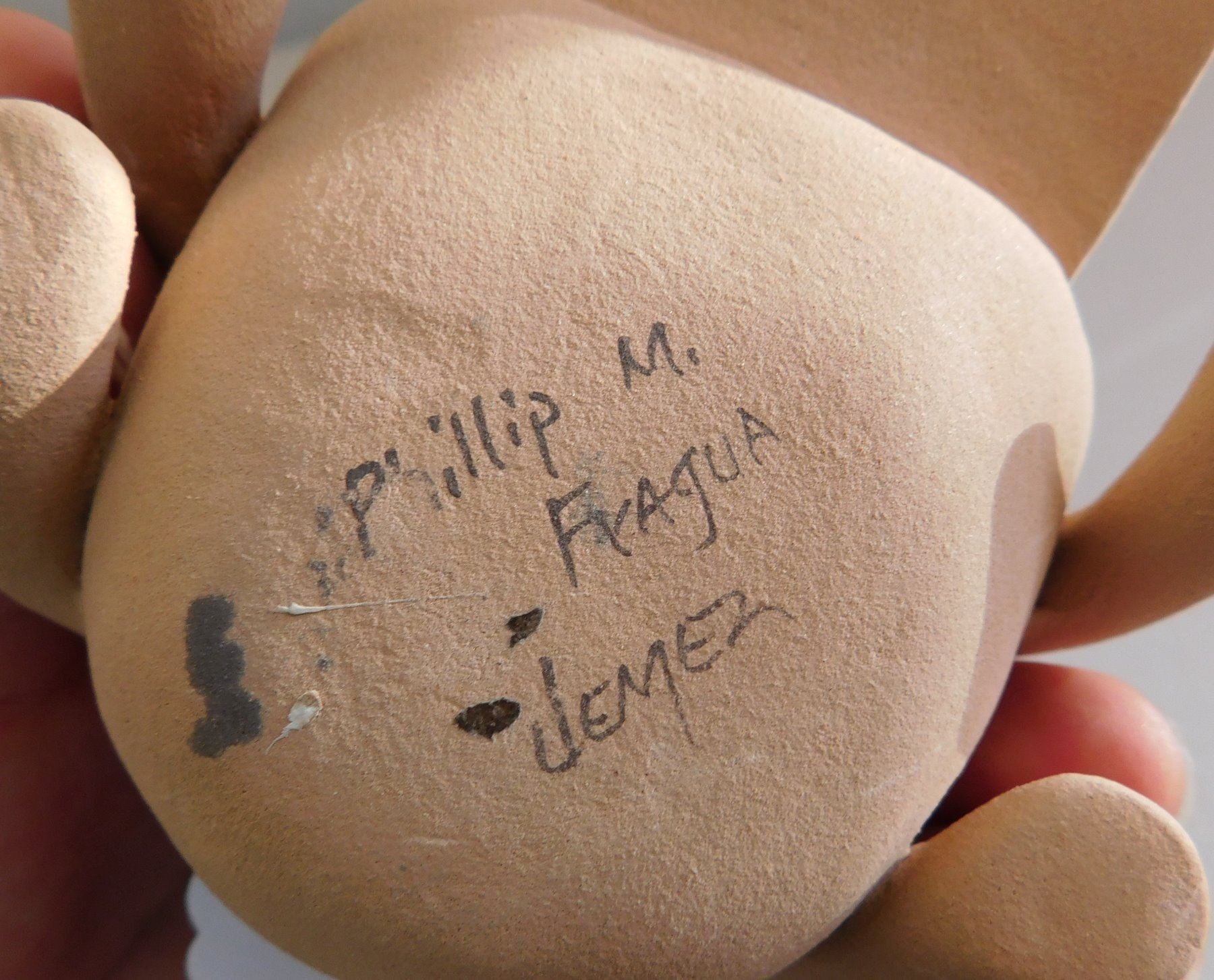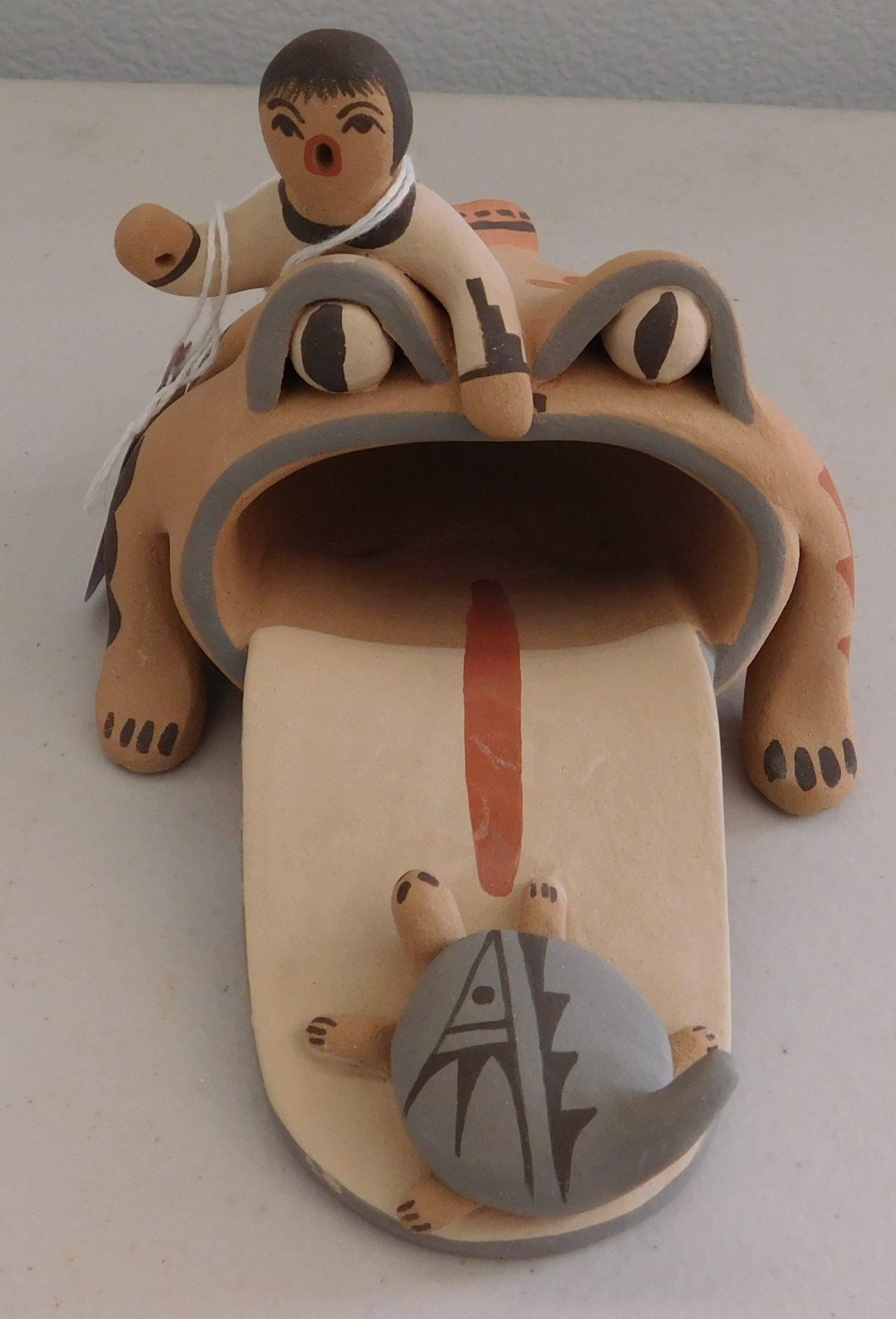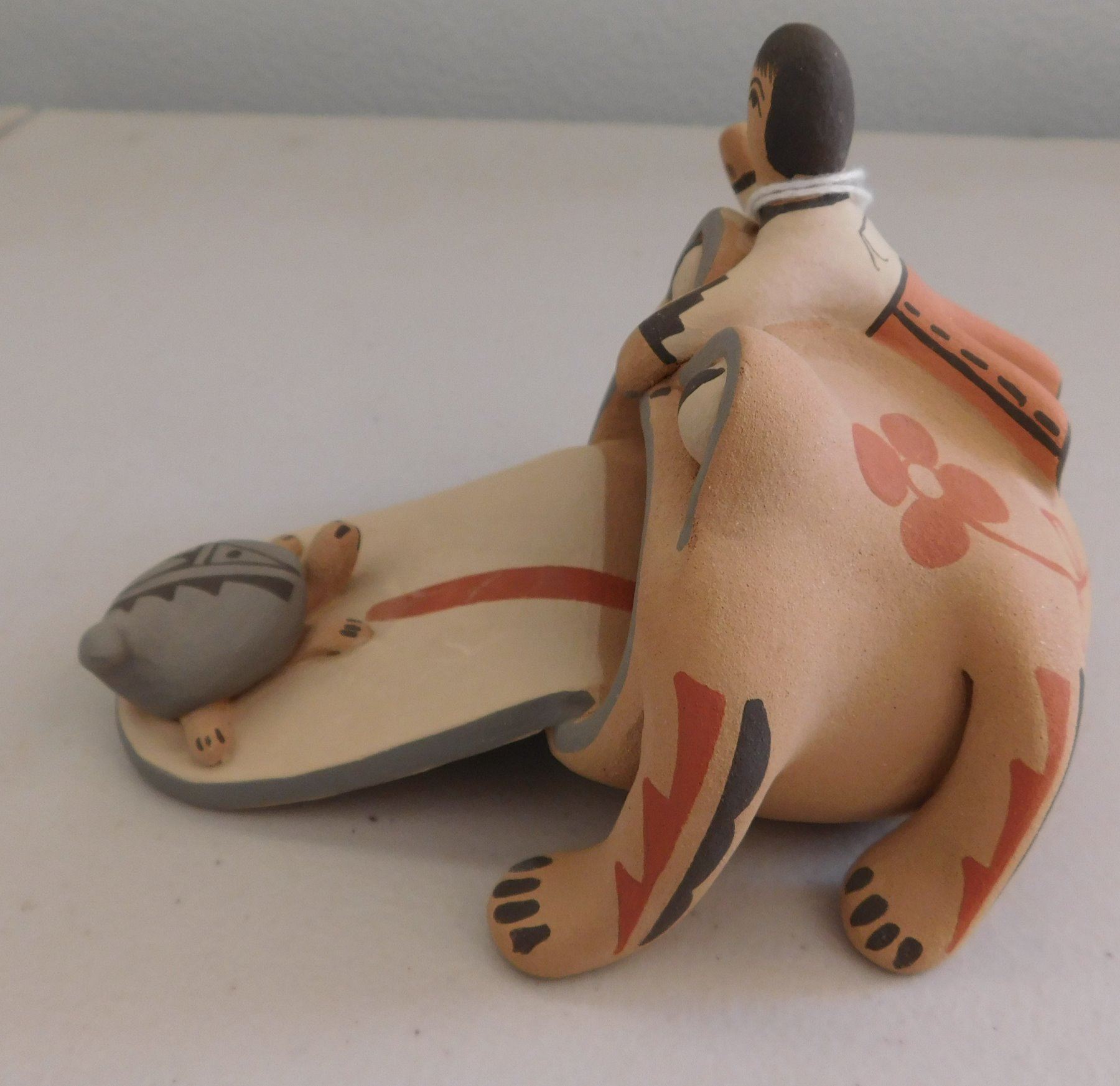 Jemez Pottery Frog Figure, c. 1970s. Made of clay and paint, the item measures 5.75" x 4" x 3.5". Jemez Pueblo, Phillip M. Fragua. Frog figure with turtle entering mouth at base of tongue and small child on back. Condition: Good, minor wear, see images. Shipping: $20.00 w/insurance and signature.