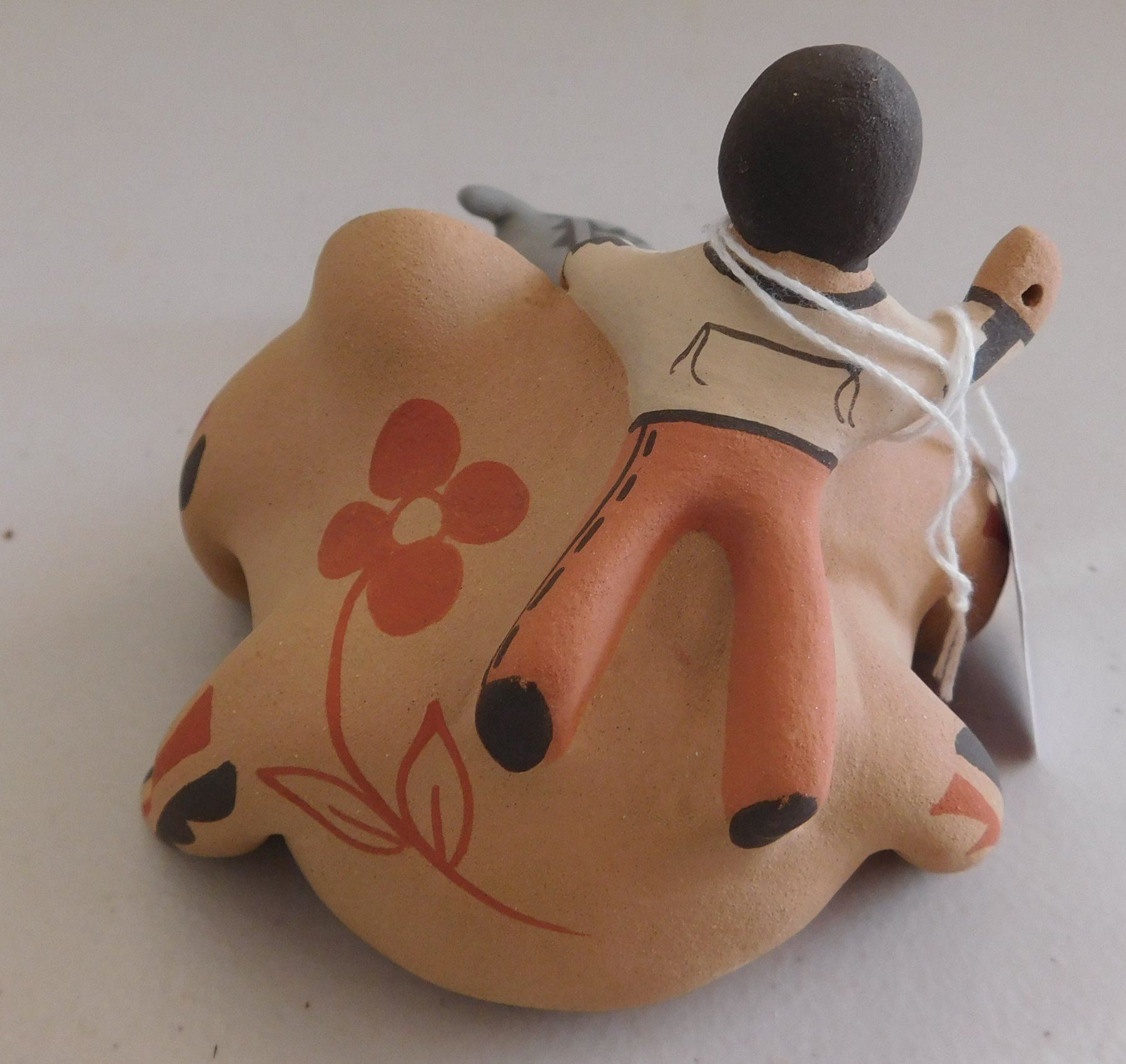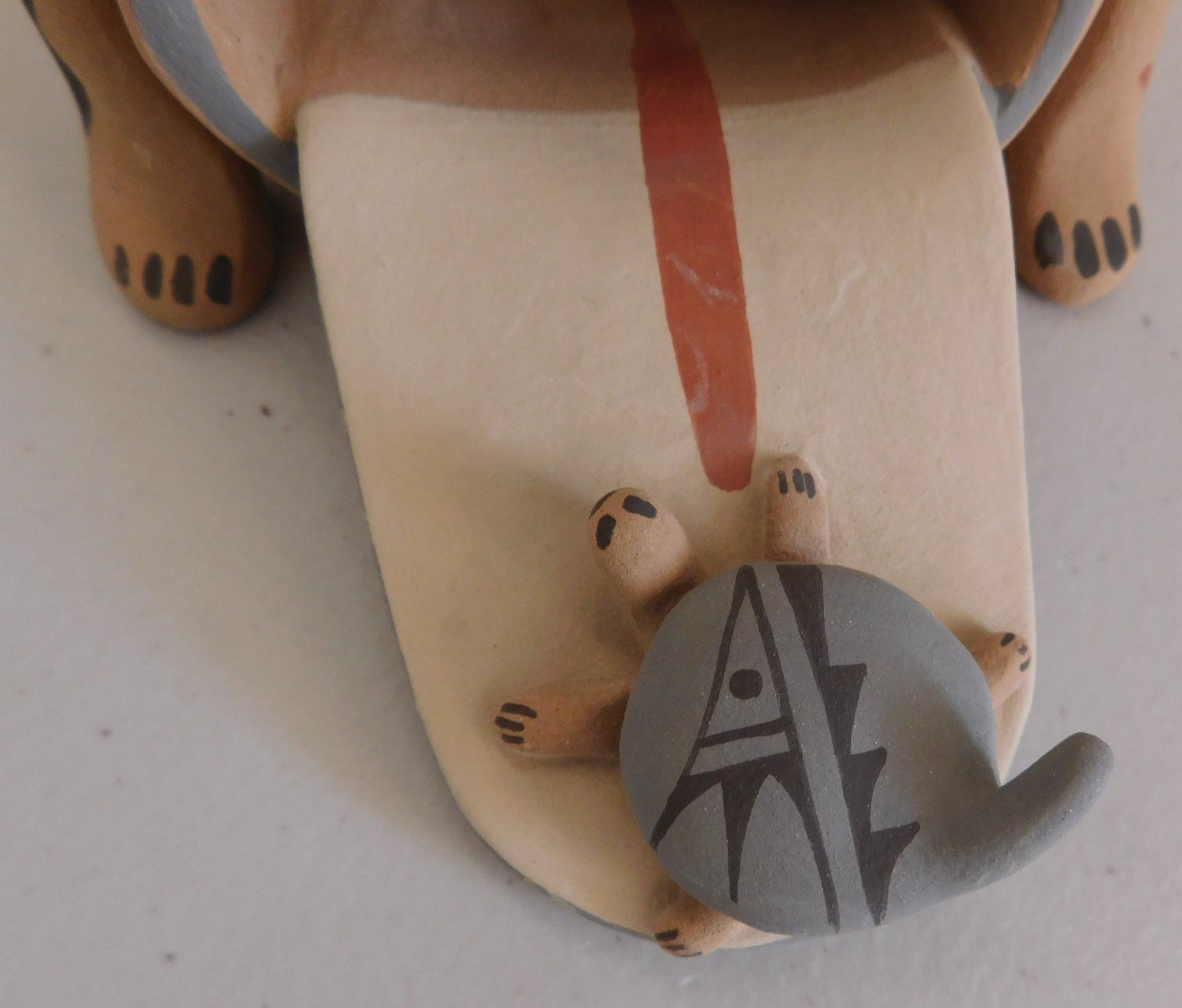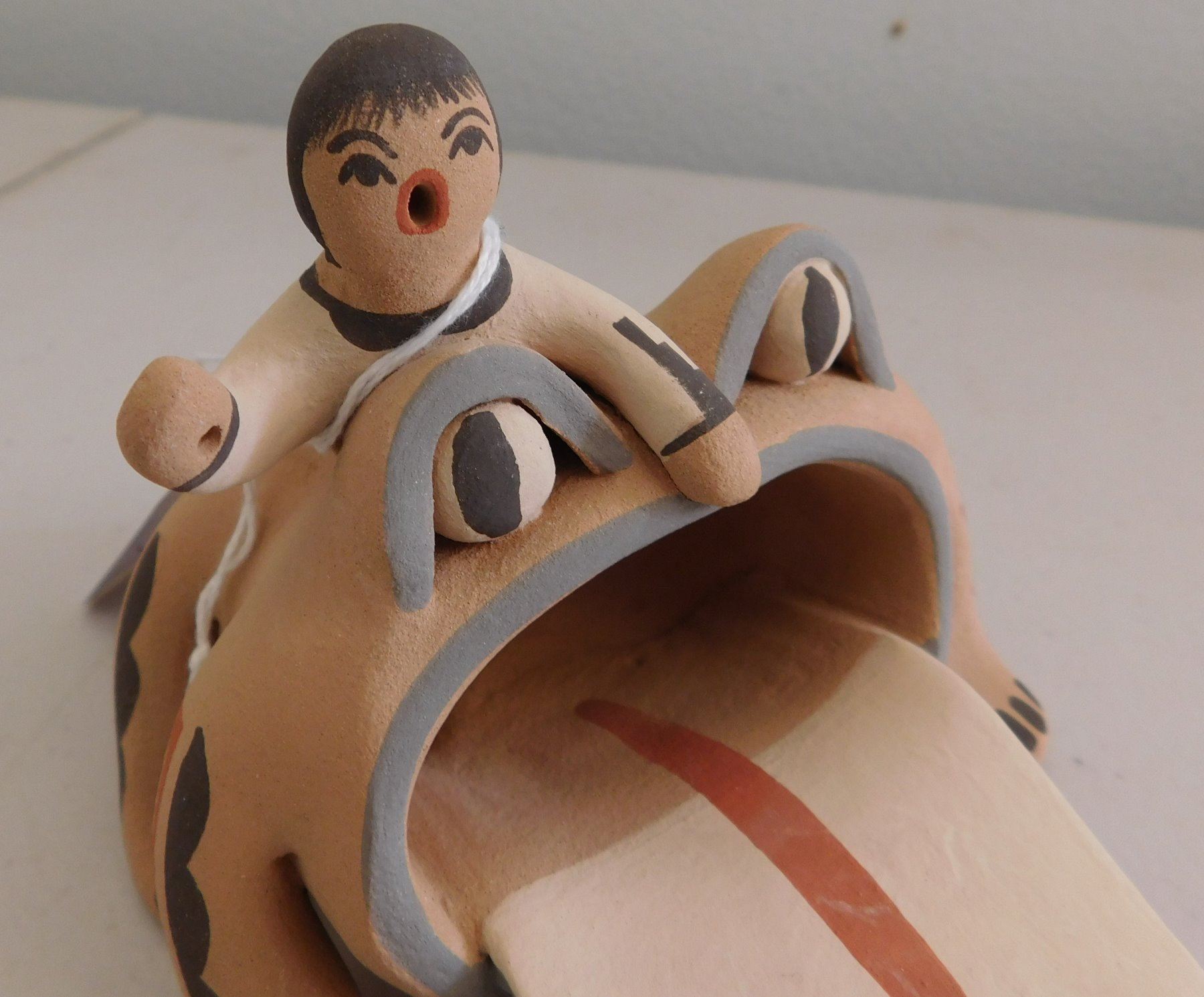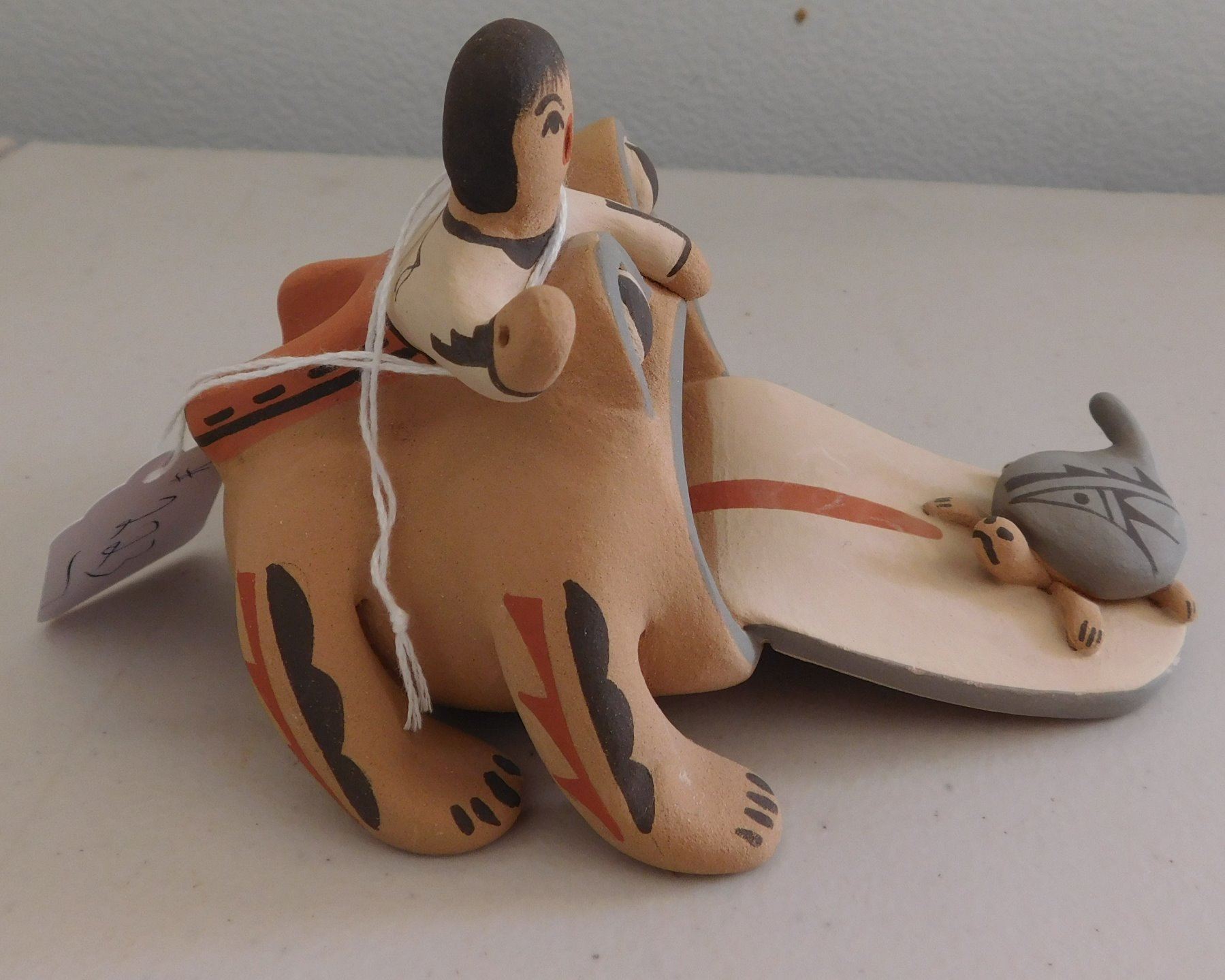 Jemez Pottery Frog Figure, c. 1970s. Made of clay and paint, the item measures 5.75" x 4" x 3.5". Jemez Pueblo, Phillip M. Fragua. Frog figure with turtle entering mouth at base of tongue and small child on back. Condition: Good, minor wear, see images. Shipping: $20.00 w/insurance and signature.