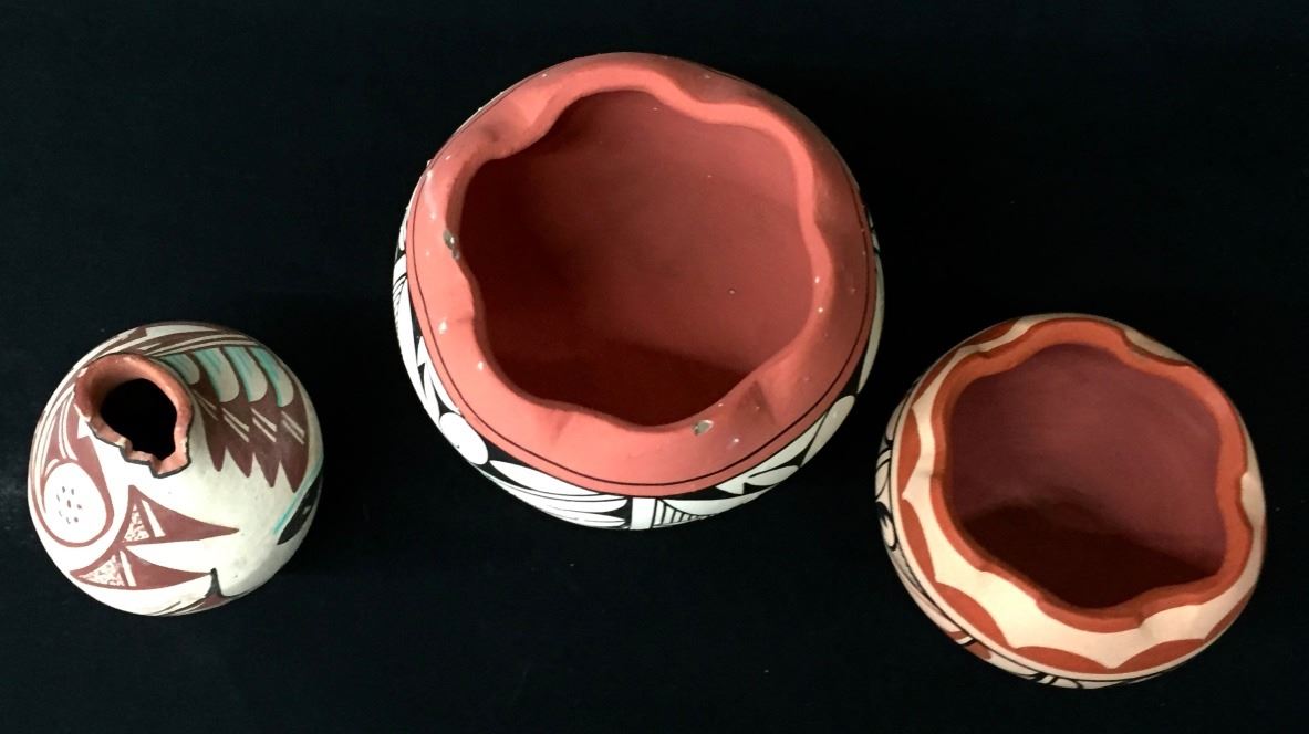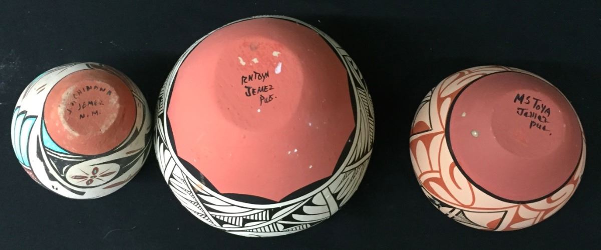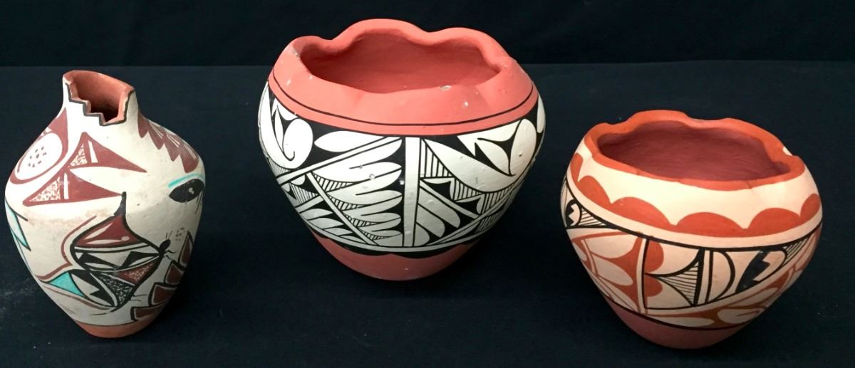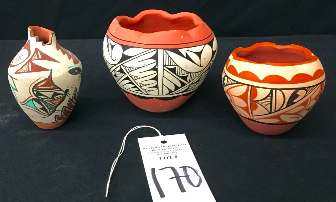 This group of 3 pots are all signed. They are from 3.25” to 4.5” high. A few slight condition issues, but pretty decent shape overall. Please look closely at the pics as they are an important part of our description. Shipping: There will be a $8 handling / packaging fee for shipping this lot. The actual cost of postage will be added on top of that.