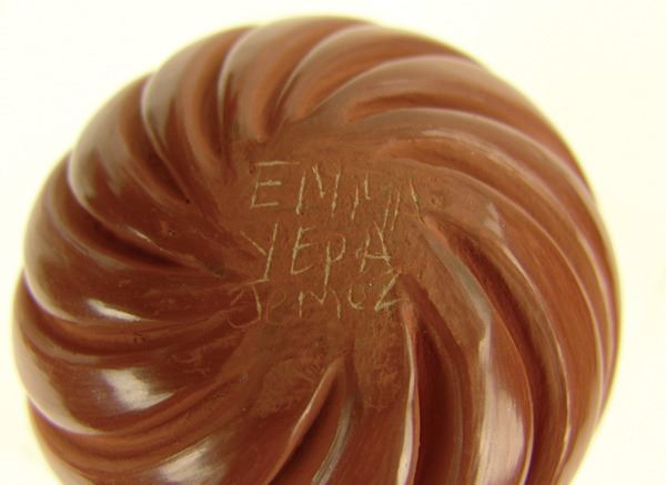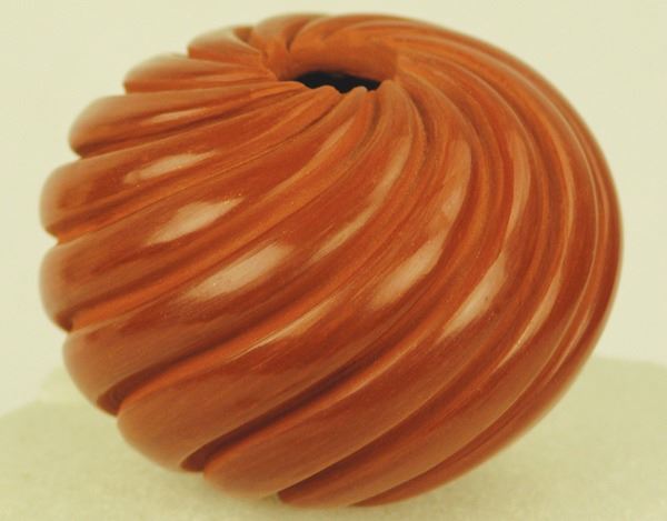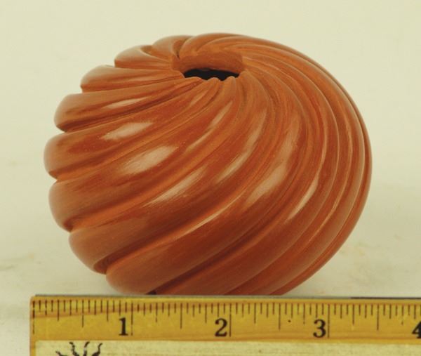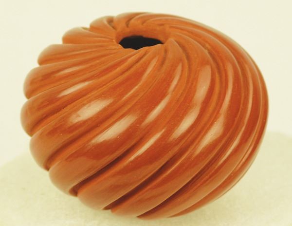 Fine, redware seed pot with deep-carved swirl design. Very good condition, signed.Late 1900s3" x 4"
