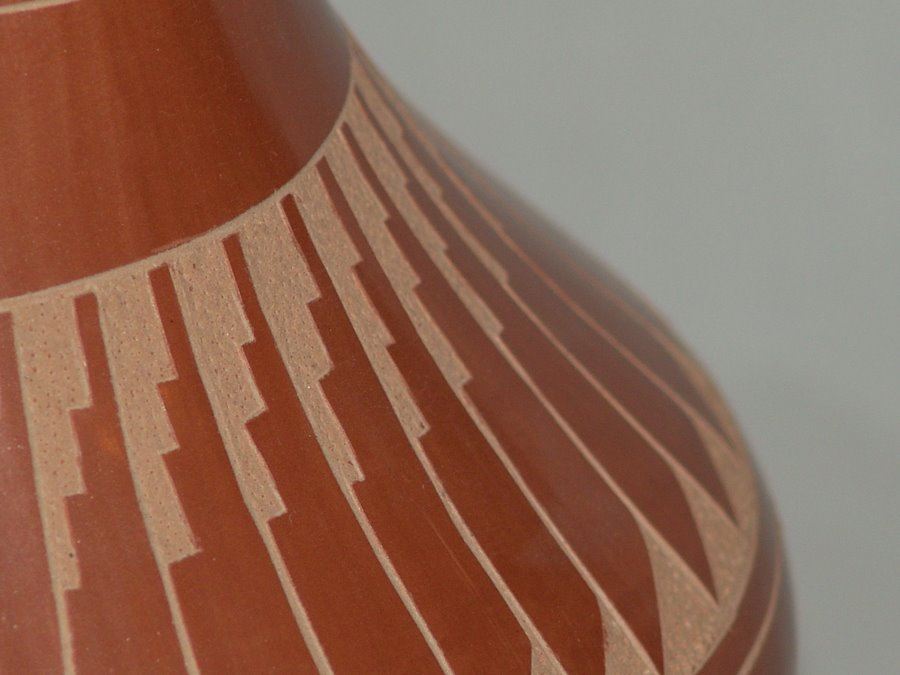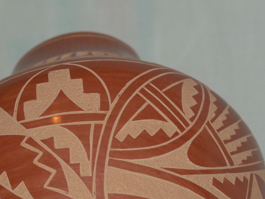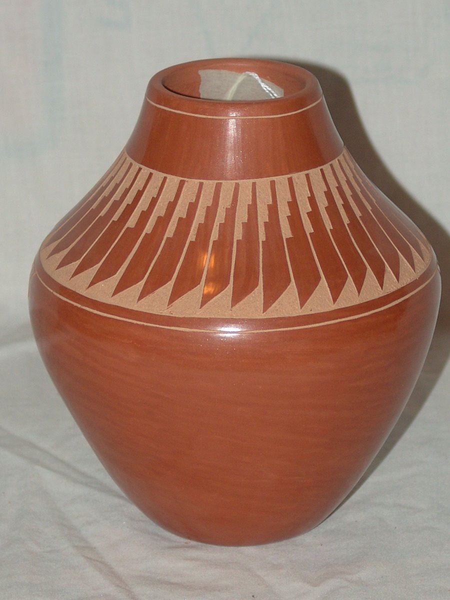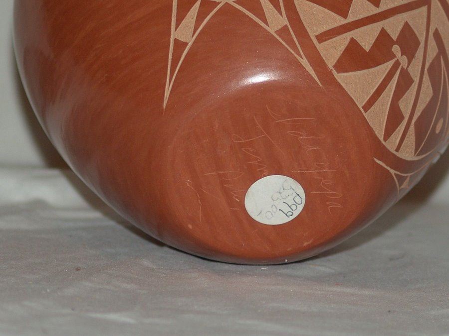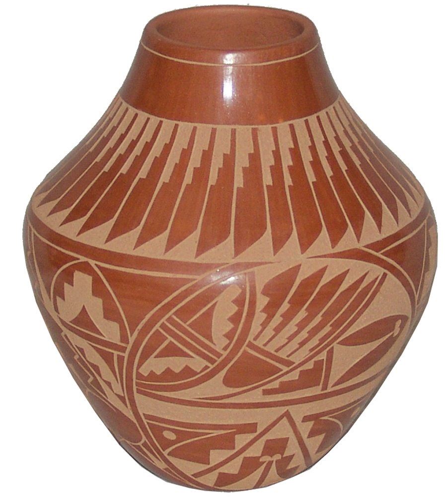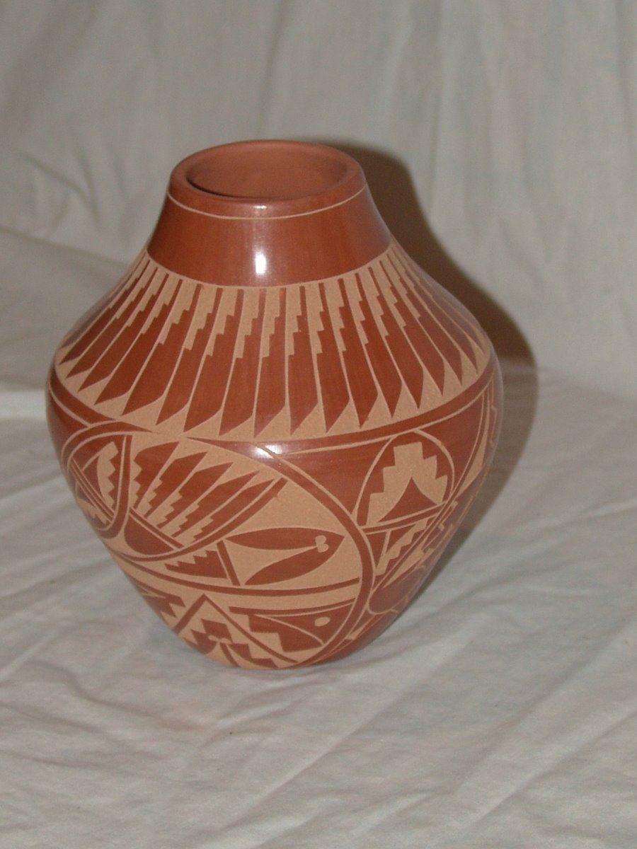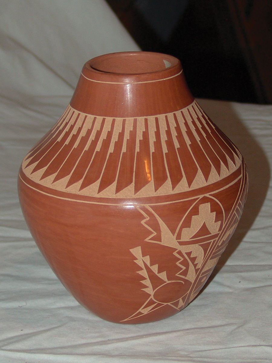 Very fine, redware pottery jar with beautiful sgraffito designs including radiating feathers, and traditional figures and symbols around the body. Very good condition.,,7" x 6"