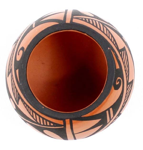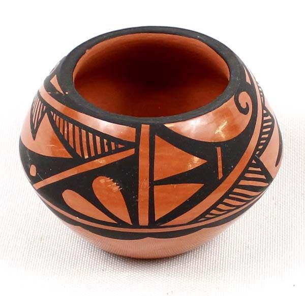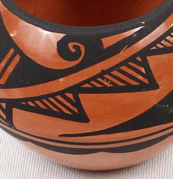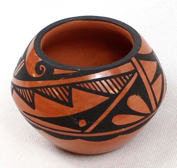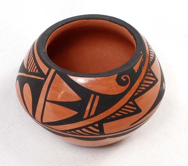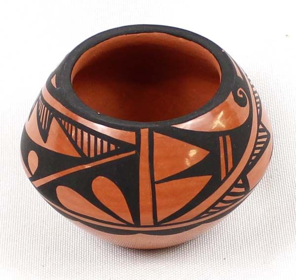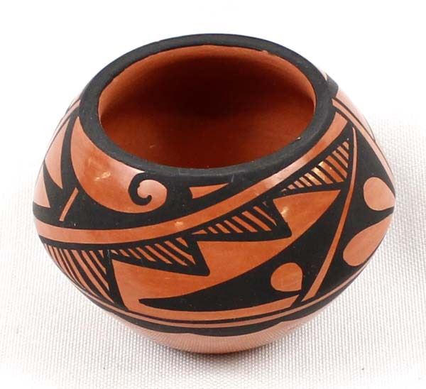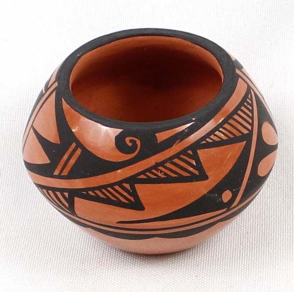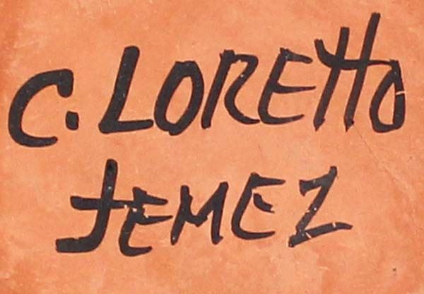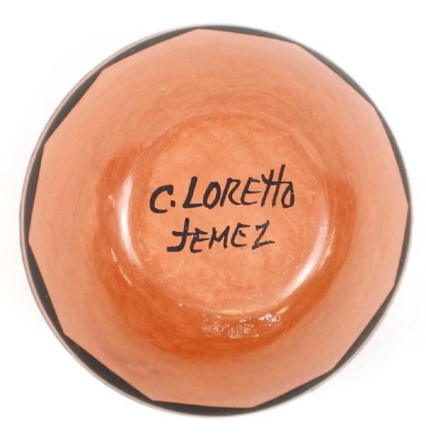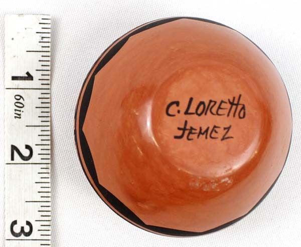 Native American Jemez Pottery Jar by Caroline Grace Loretto, measures 1.75'' x 2.5'' and is signed on the bottom, FYI: ''Jemez Pueblo artist Caroline Loretto is known for her polychrome pottery. Caroline (b. 1953) comes from a family of potters and she is known for her deep polish and fine painting.''