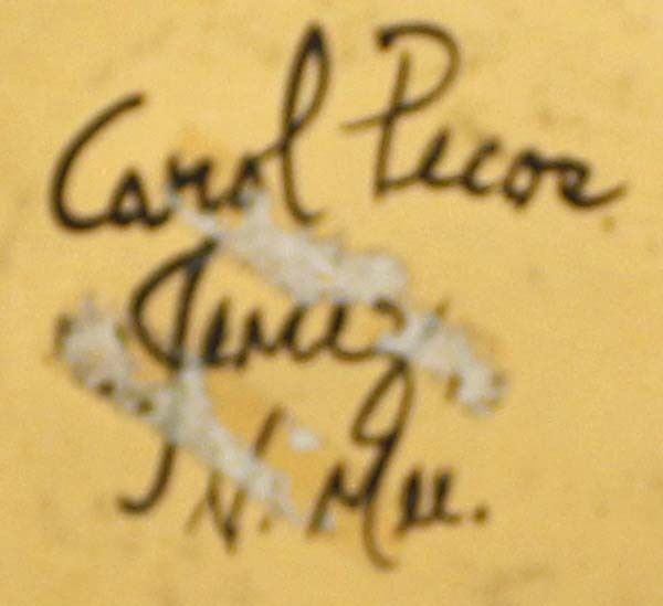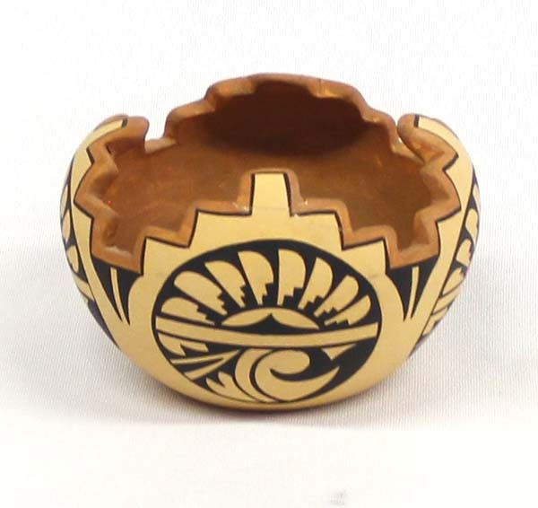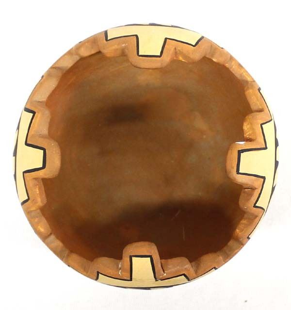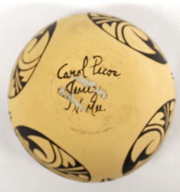 Native American Jemez Pottery Kiva Bowl by Carol Toledo Pecos, measures 3'' x 3.75'' and is signed on the bottom, one tip has been glued, Carol Pecos was born into Jemez Pueblo in 1934. Sun Clan, active ca. 1950s-present, known for her redware jars, bowls, seed pots, wedding vases, Storytellers, Corn Maidens, and figures''