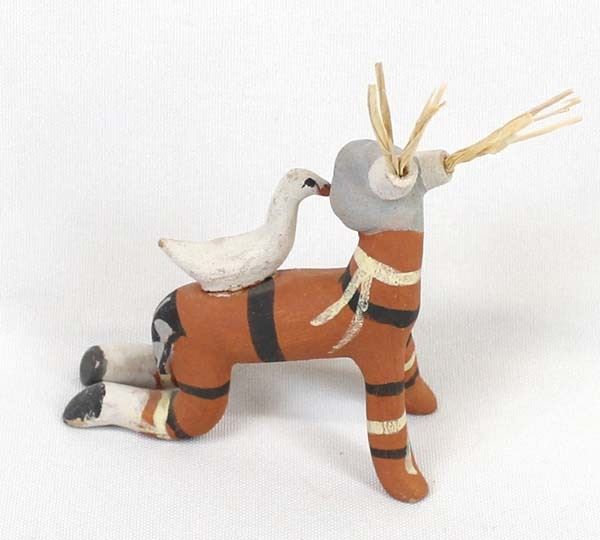 Native American Jemez Pottery Koshare Clown by Chris Fragua, measures 4'' x 3'' x 1.5'' and is signed on the bottom, features white goose on his back, left arm has been glued