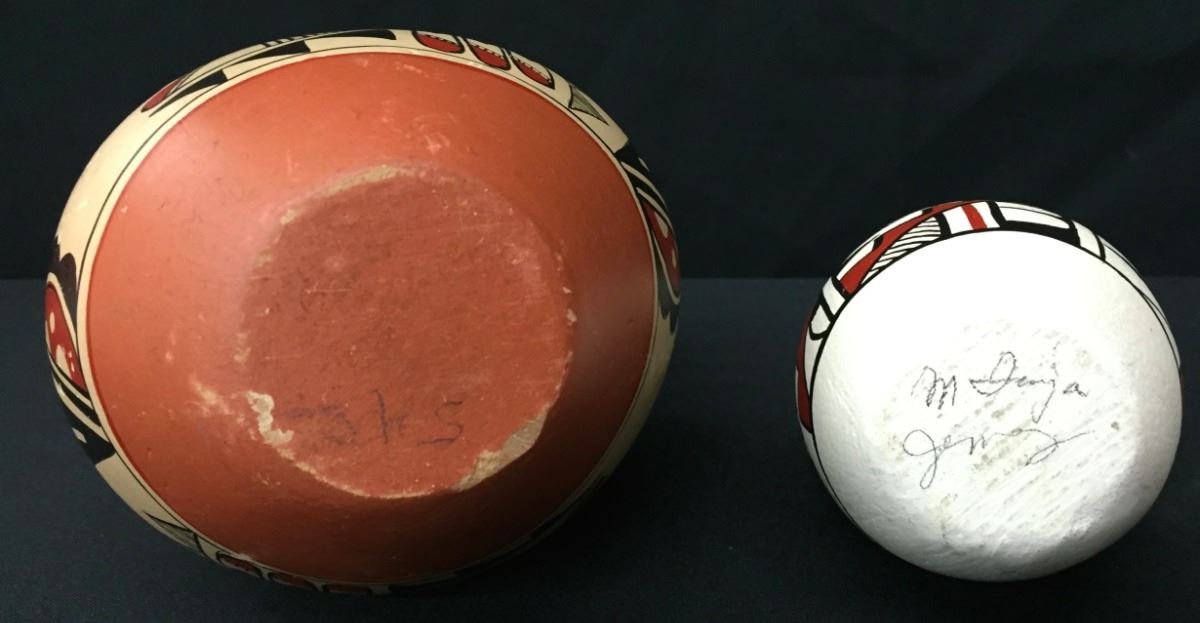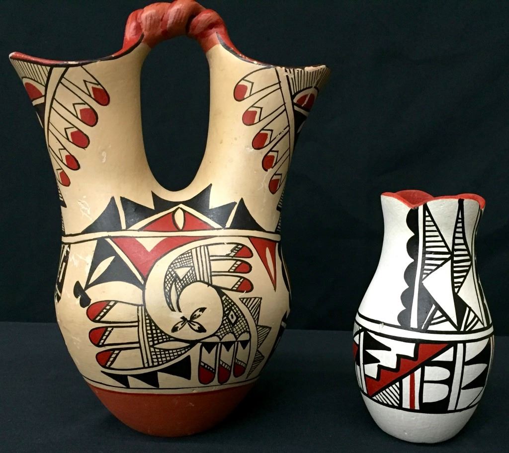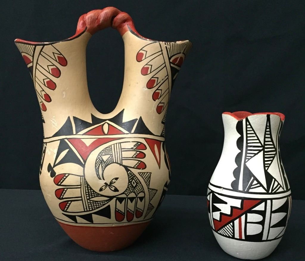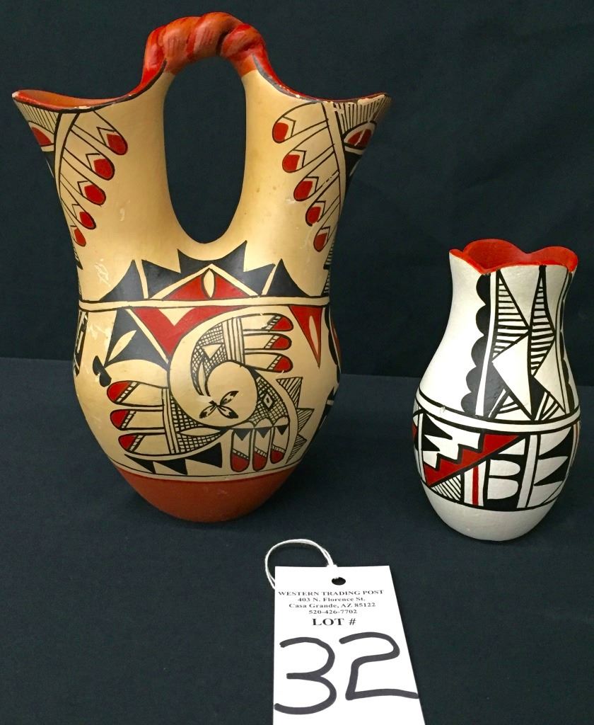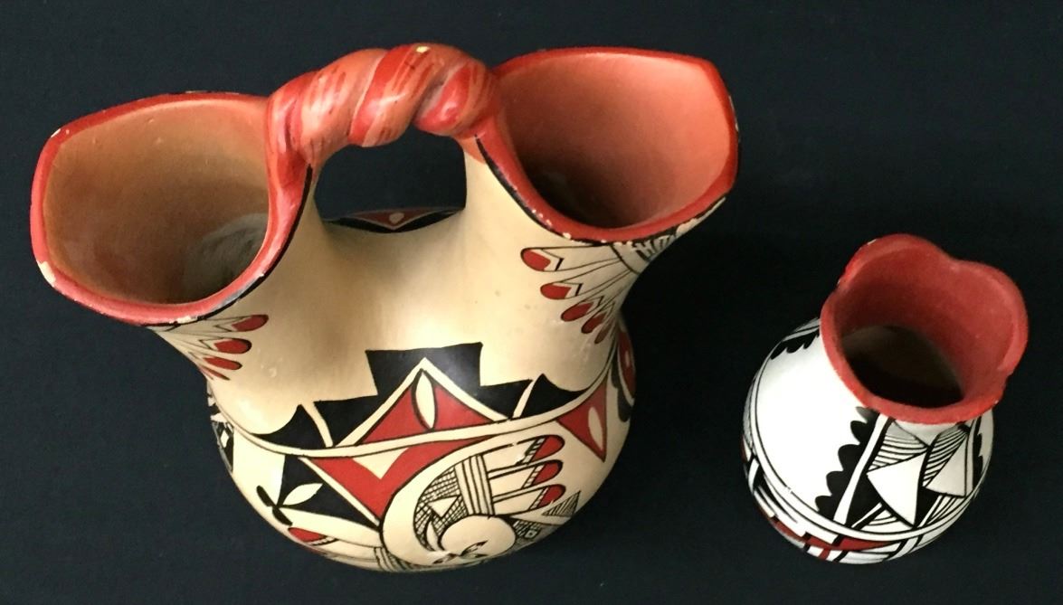 There are 2 vintage Jemez pots in decent condition. The wedding vase measures 9" tall and has a few scratches. The other pot measures 6” tall and is in good condition. Please look closely at the pics as they are an important part of our description. Shipping: There will be a $7 handling / packaging fee for shipping this lot. The actual cost of postage will be added on top of that.
