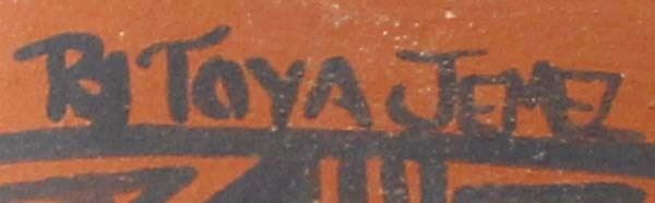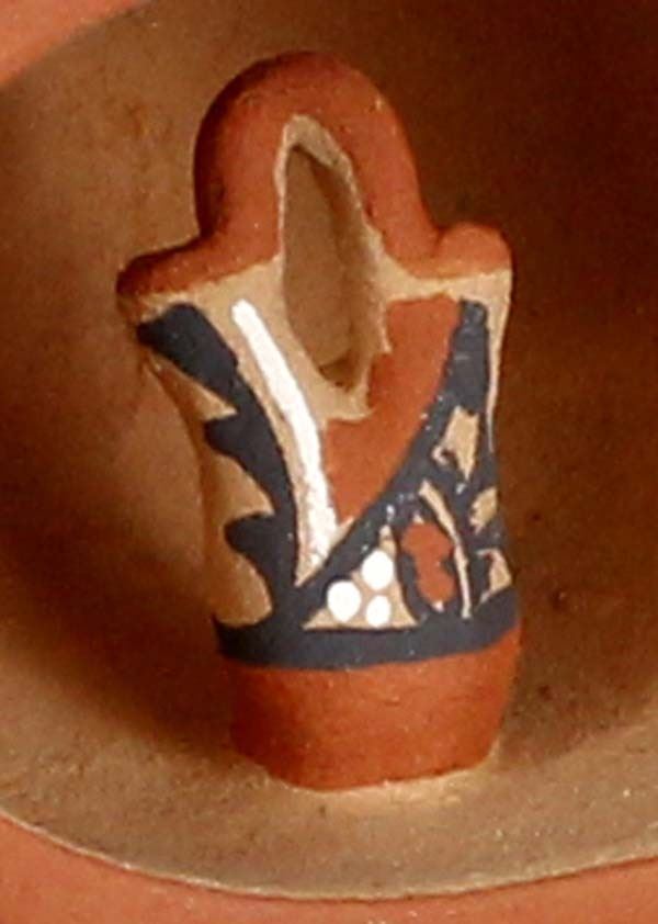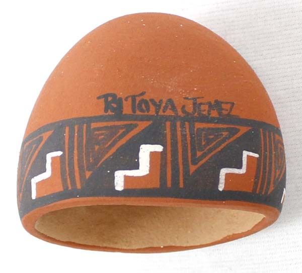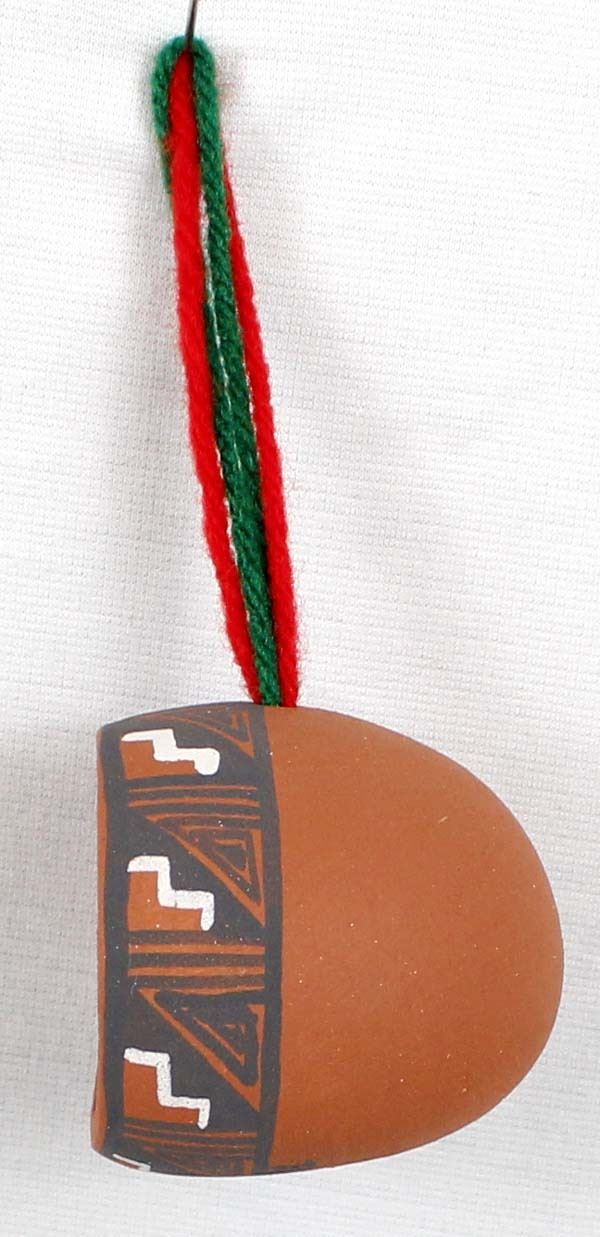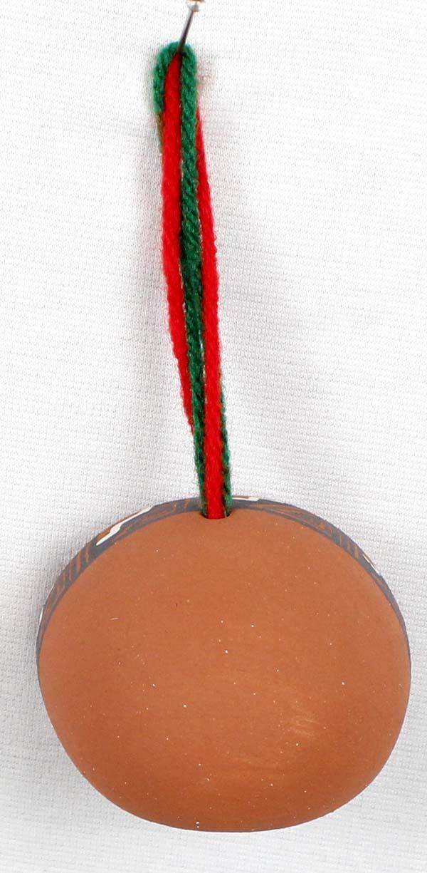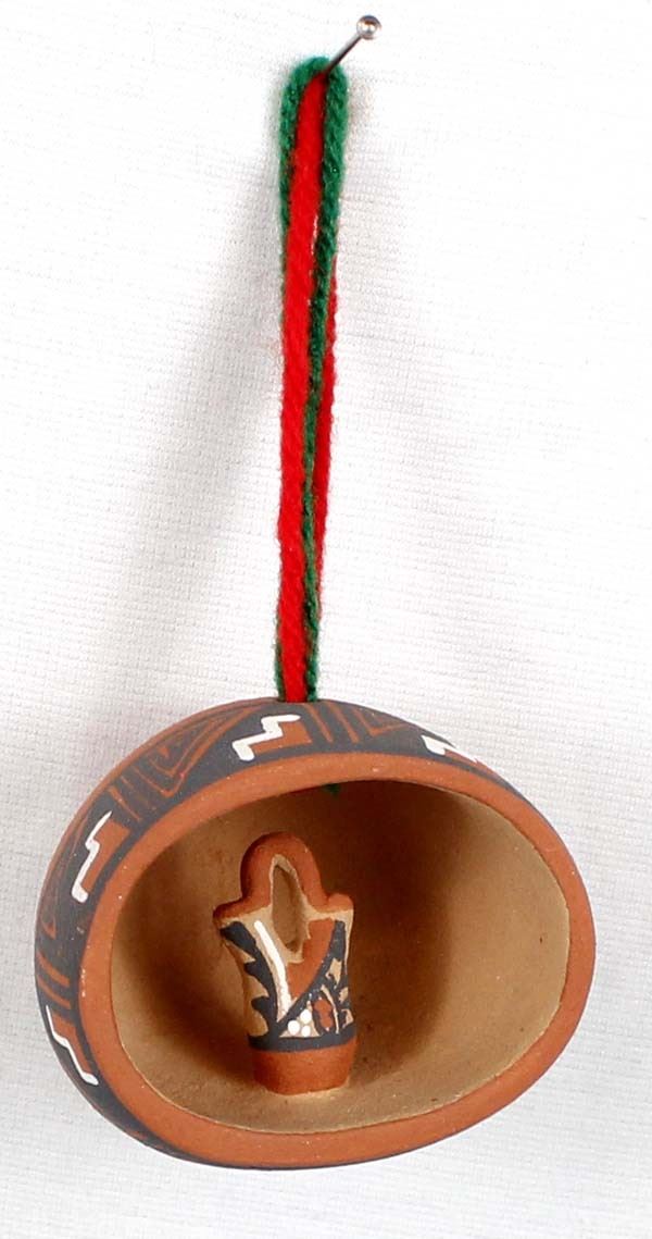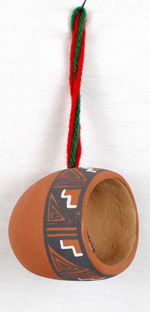 Native American Jemez Pottery Ornament by B. J. Toya, measures 2.5'' x 2'' x 2.5'' and is signed on the bottom, red and green yarn loop for hanging, inside of ornament is a miniature pottery wedding vase