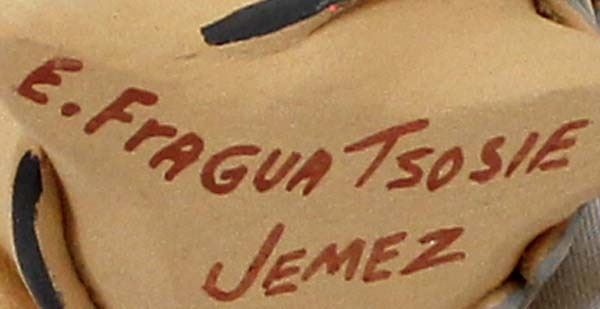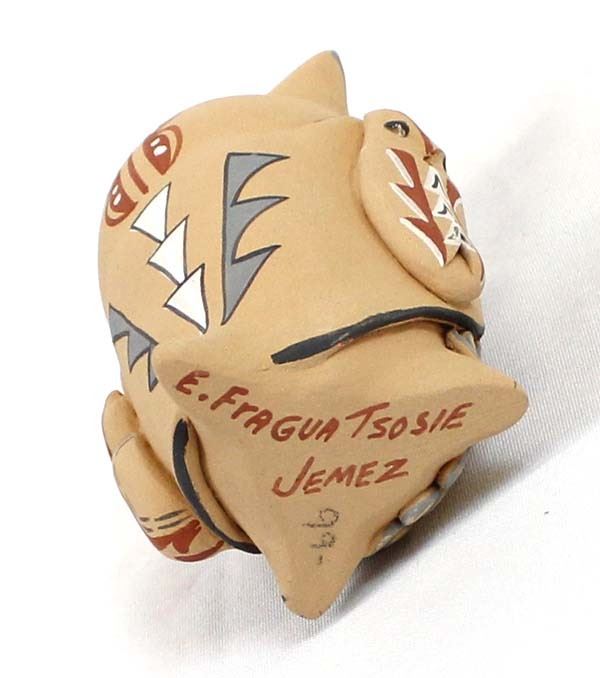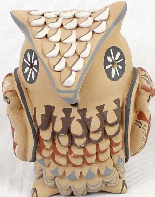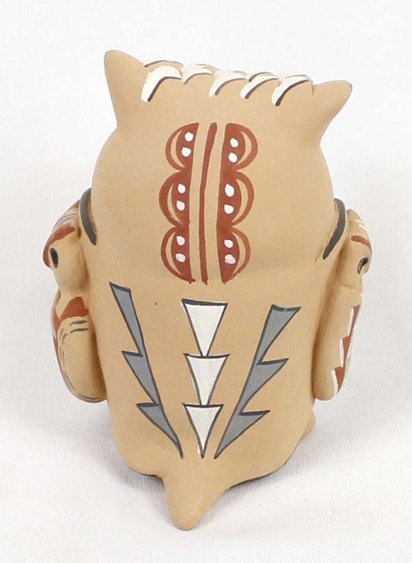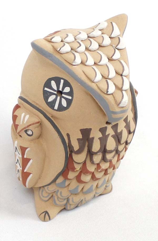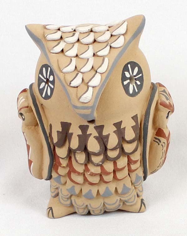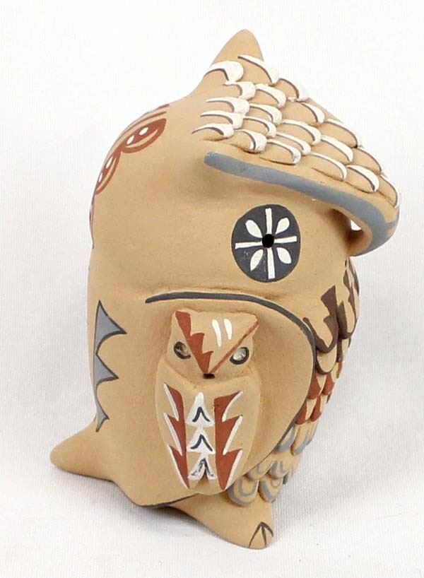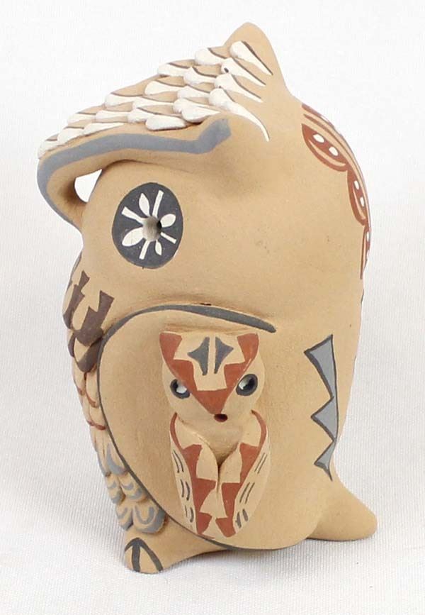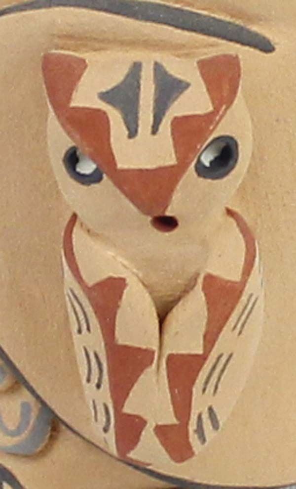 Native American Jemez Pottery Owl Storyteller by E. Fragua Tsosie, measures 4.25''H x 3.25''W x 3.5''Deep and is signed on the bottom