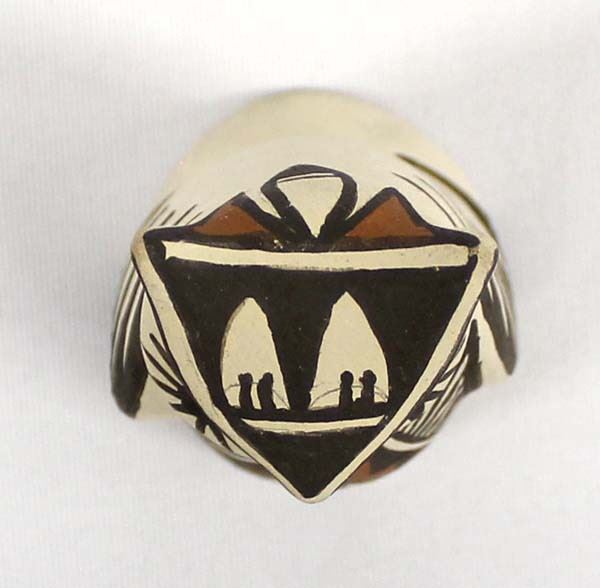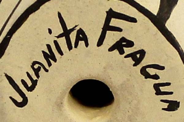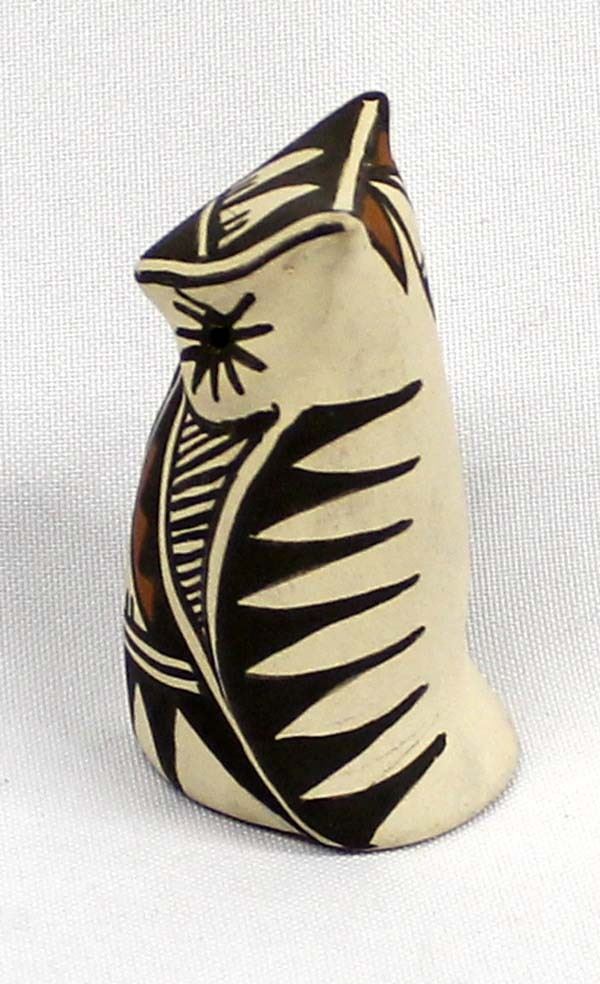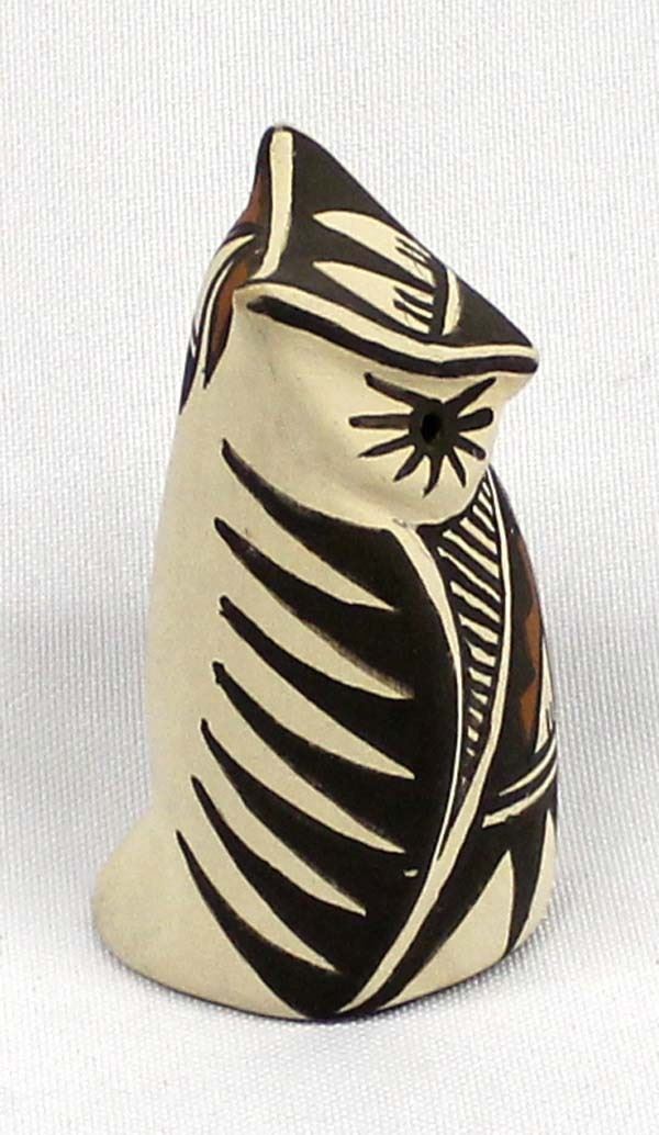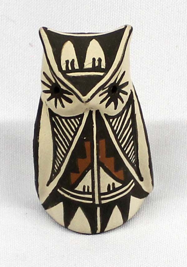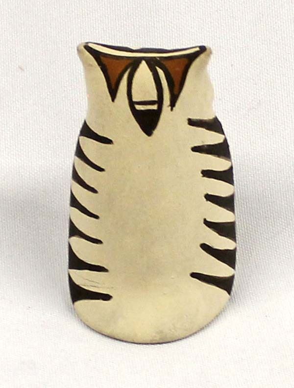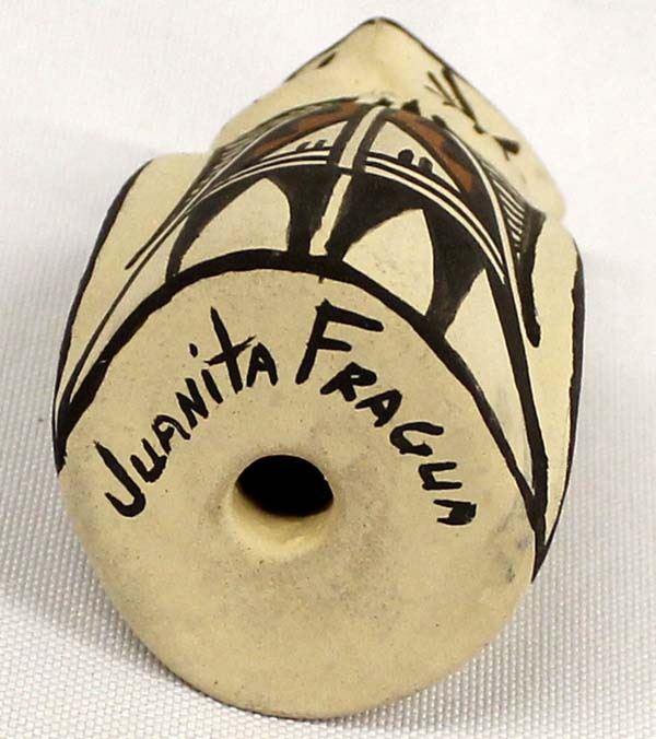Native American Jemez Pottery Owl by Juanita Fragua, measures 1.5'' x 2.5'' and is signed on the bottom