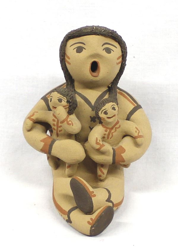 Native American Jemez Pottery Storyteller by Bonnie Fragua, measures 4'' x 4.5'' x 4'' and is signed on the bottom, FYI: ''Bonnie Fragua was born into Jemez Pueblo on March 26, 1966, and has been making pottery since she started learning from her mother, Grace Loretto, when she was eight years old. She specializes in monks and storytellers of different sorts.''