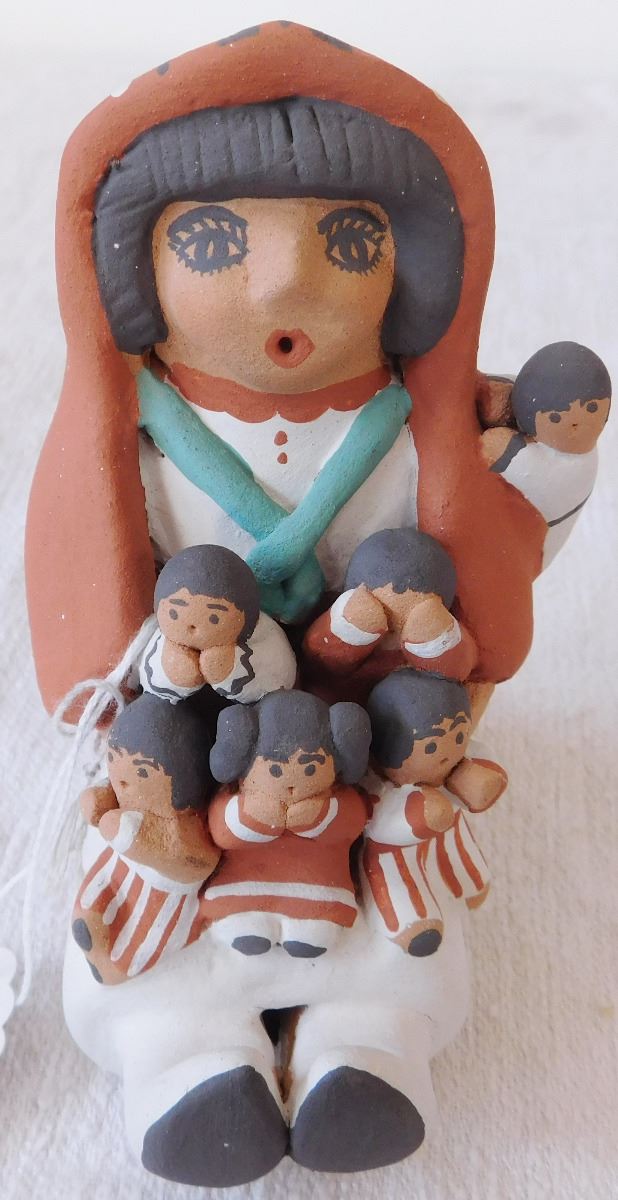 Jemez Pottery Storyteller, circa 1980s. Made of clay and paint, this item measures approx. 5.5" x 3.25" x 3.75". Jemez Pueblo, New Mexico, signed Anita Cajero. Condition: Very good, minor paint nicks, see images. Shipping: $22.50 w/insurance and double-boxed.