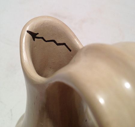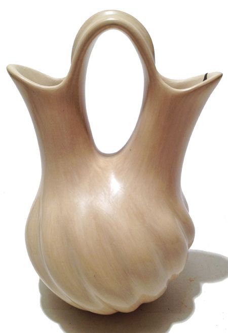 Late 1900s, Beautiful cream slip pottery wedding vase with a gentle swirl motif including a heartline arrow pointing out of one of the openings. Very good condition. 8-5/8" x 5-3/4"