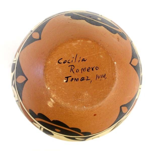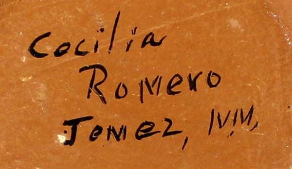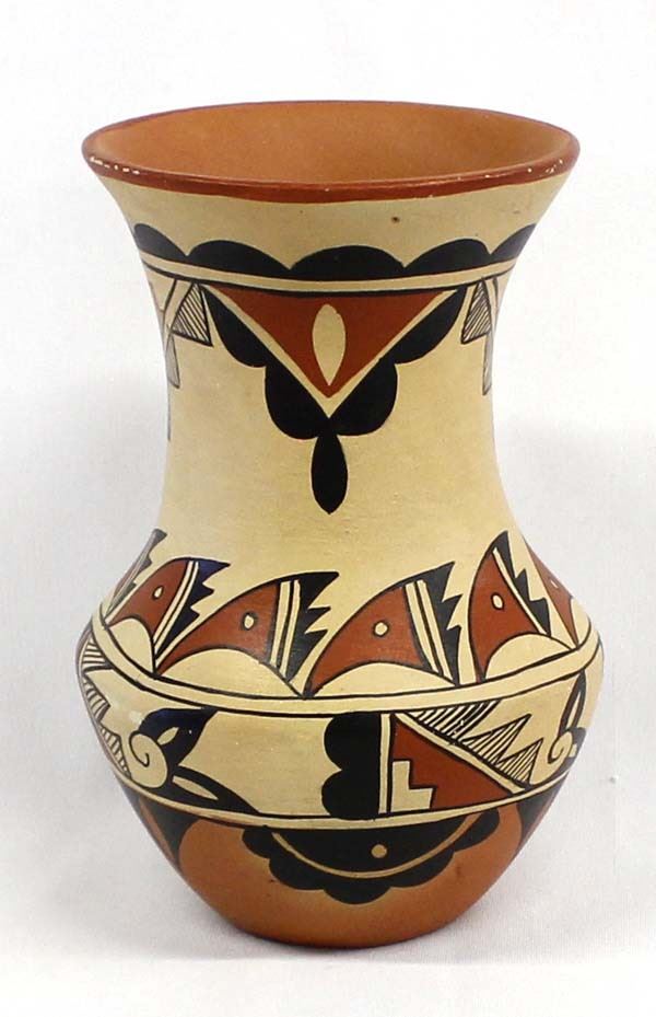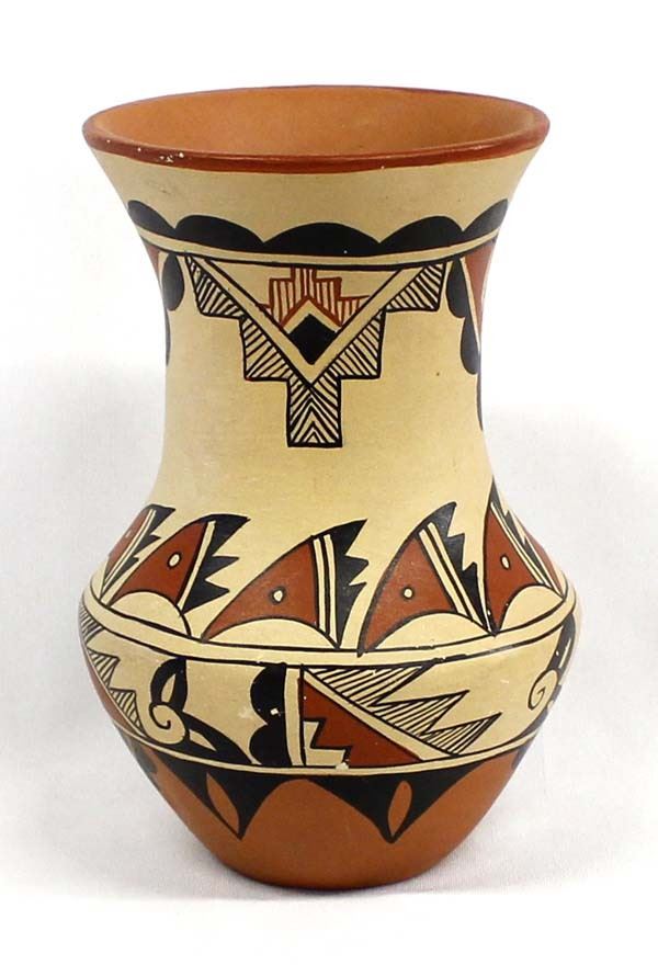 Native American Jemez Pottery Vase by Cecilia Romero, measures 8''H and is signed on the bottom, stylized parrot head designs
