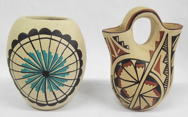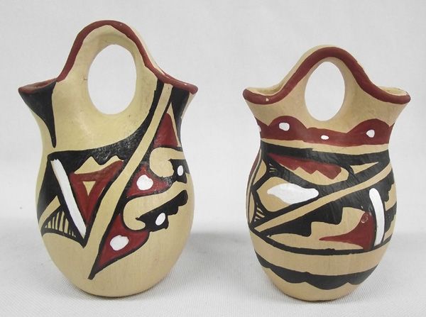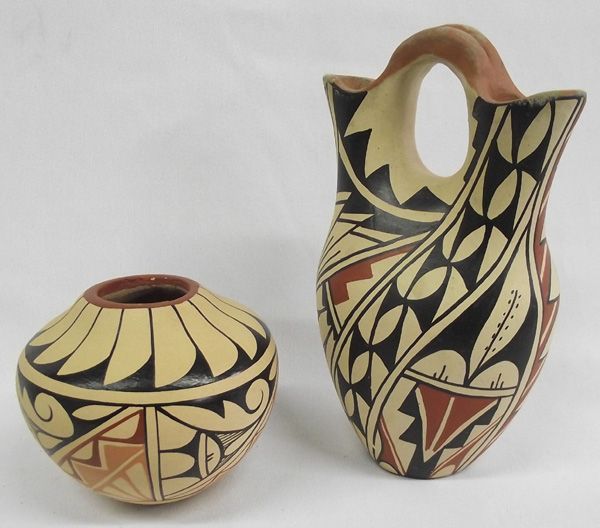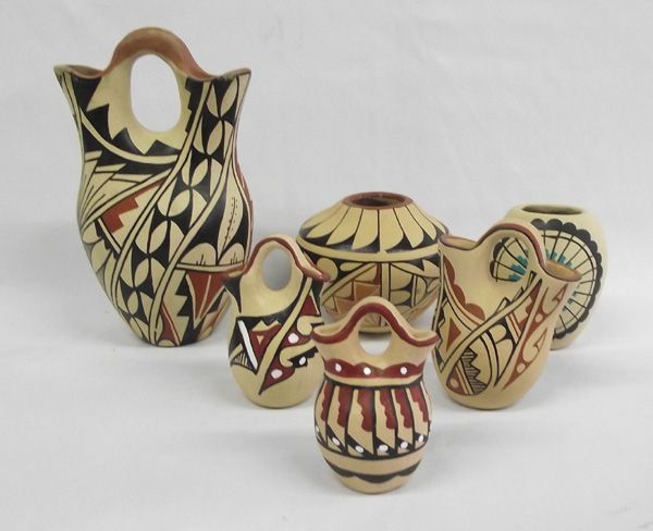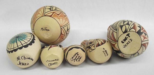 6 Jemez Pottery Vases and Jars. This nice group includes 4 wedding vases and two jars. The largest wedding vase measures 6.5''H x 4''W. #1 Wedding Vase by C.W.T. Jemez #2 Vase by M. Chinana Jemez #3 Wedding Vase by M. Abeyta Jemez #4 Wedding Vase by Chinana Jemez Pue. NM #5 Wedding Vase by Chinana Jemez #6 M M Toya