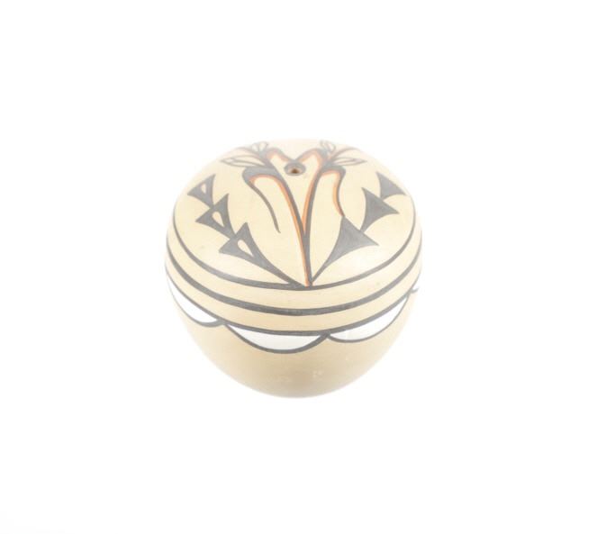 Featured in this lot is this polychrome pottery salt shaker from Jemez Pueblo artist M. Kay. The salt shaker features a wonderfully and professionally crafted pottery or ceramic construction that shows geometric patterns with a heart figural in the center. The salt shaker is marked on the bottom as follows: M. Kay - Jemez. The condition of this Jemez salt shaker is good with no obvious signs of damage and shows good overall condition. The measurements of this Jemez salt shaker is 2 1/2" x 2 3/4" x 2 3/4". The collective weight of this salt shaker is U6oz. This pottery piece was displayed in Harry & Toots Lafavor Indian Arts & Crafts out of Parker, Arizona.