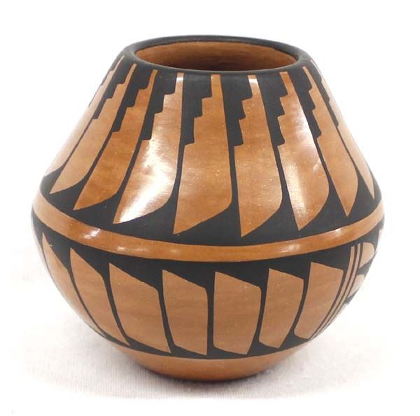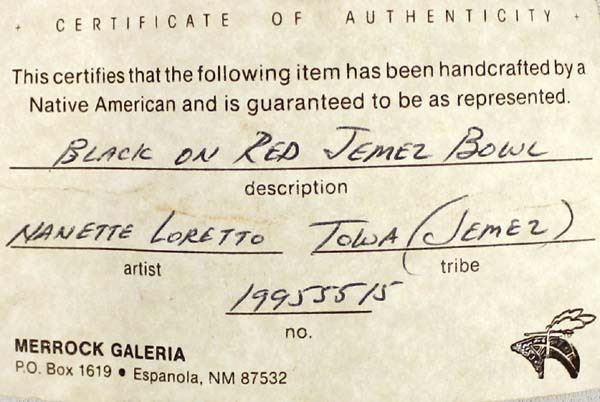 Native American Jemez Pueblo Pottery Jar by Nanette Loretto, measures 3.5'' x 3.5'', highly burnished, stylized feathers, water, bear paw, and kiva step designs, signed on the bottom, comes with COA