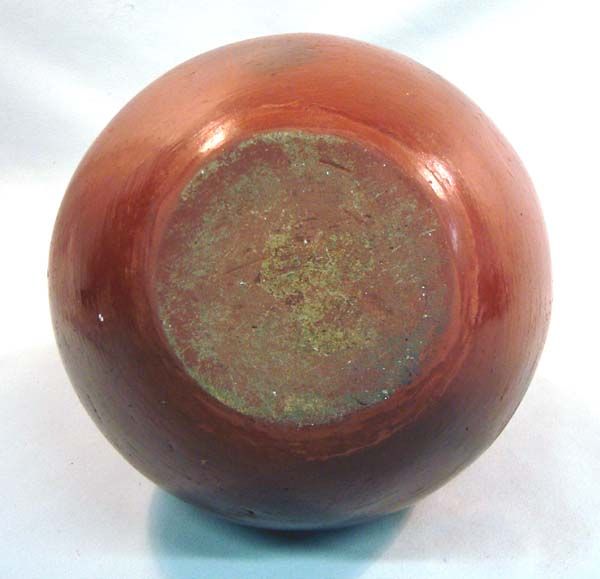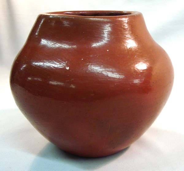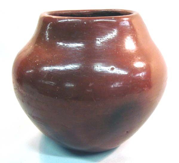 Jemez Pueblo Pottery Jar. Rich burnished reddish brown jar. Thick walls and heavy weight jar. There are tiny chips in the finish around the jar and a few thin line scratches. Measures 5.75''H x 6.75''W.
