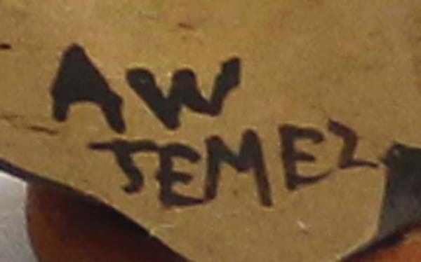 Native American Jemez Pueblo Pottery Storyteller, measures 3'' x 3.5'' and has artist's initials A.W. on the bottom