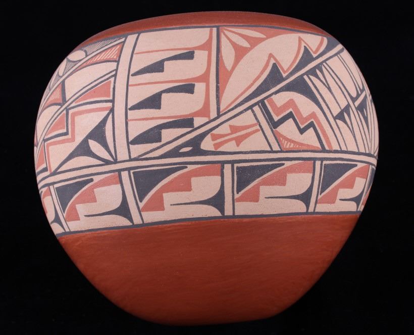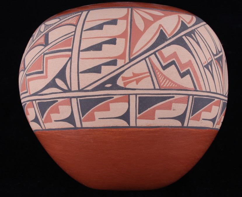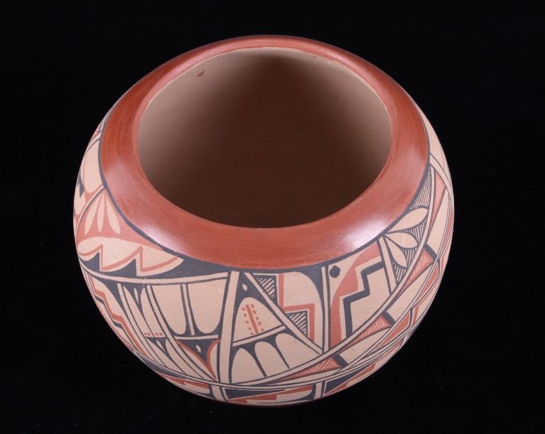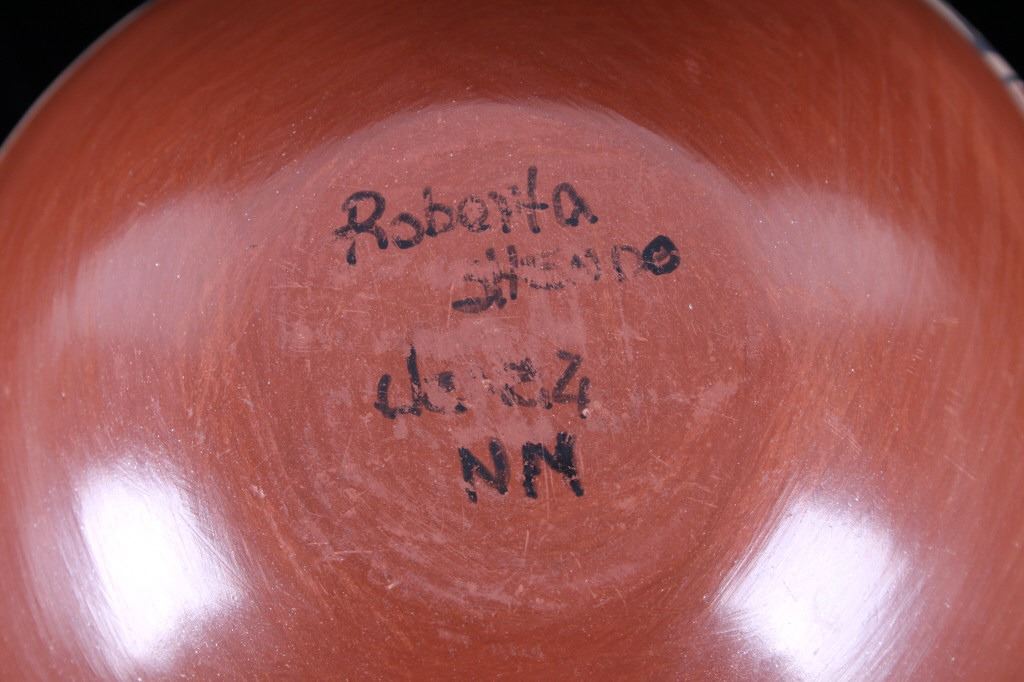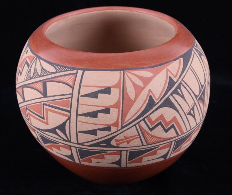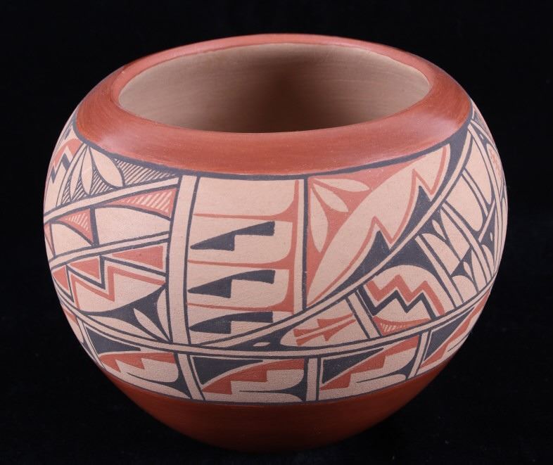 In this lot is a beautiful, Native American pot crafted by Roberta Shendo of the Jemez Pueblo in New Mexico.