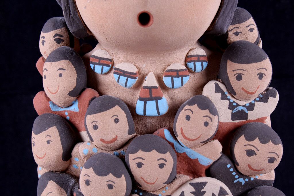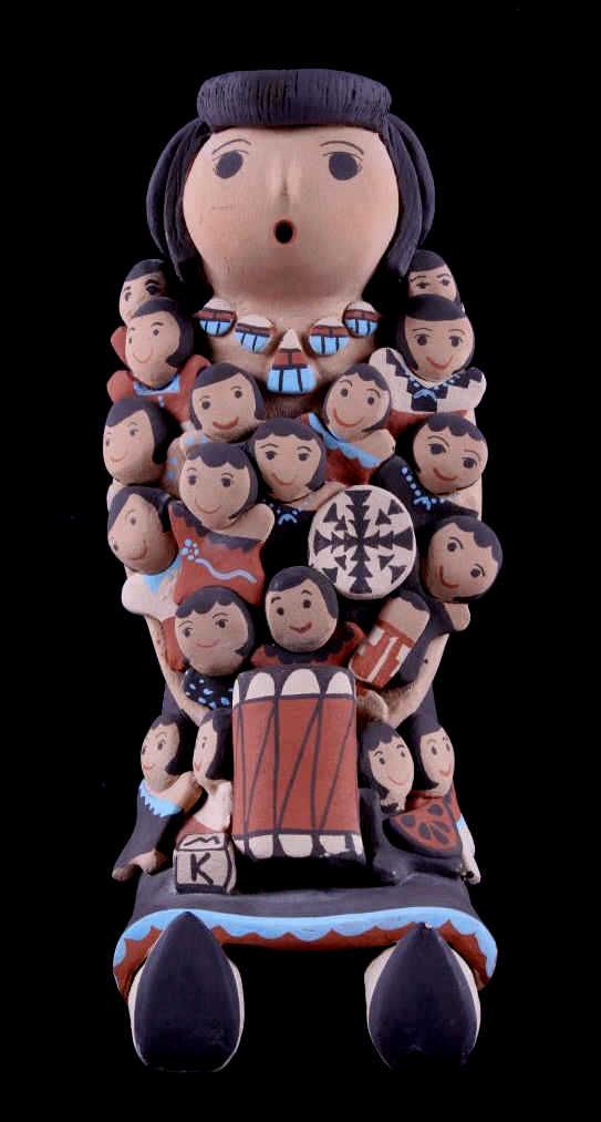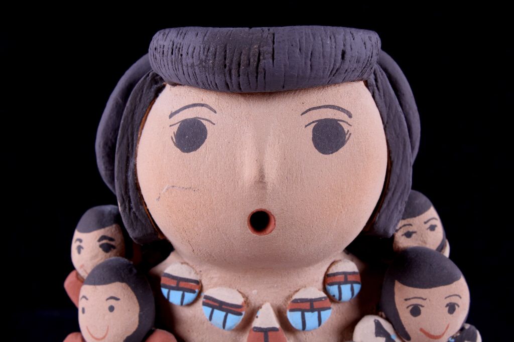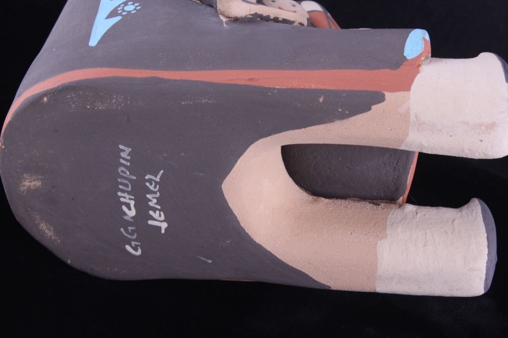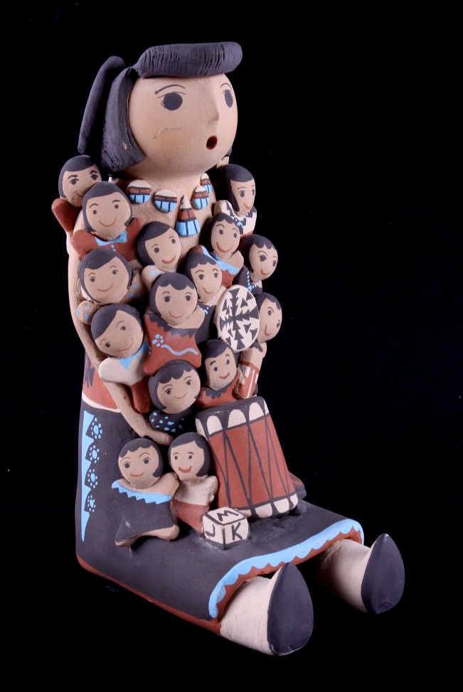 This is an original Jemez Pueblo Native  American Indian storyteller figure. The piece  is hand crafted pottery with wonderful  paints. This shows a main story telling  figure with 18 smaller children figures across her front. Bottom signed, "G. Gachupin  Jemez." This is a mid 20th century vintage  piece. Measures 9.75"x3.75"x6 1/8"