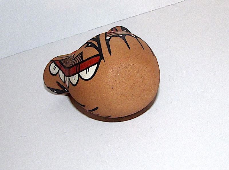 Jemez Pueblo Wedding Vase Mini. 4" tall. Signed. This wedding vase is a traditional clay piece created by the artisan from the Jemez Pueblo in New Mexico. Wedding vases are distinctive ceremonial vessels with two spouts connected by a handle, symbolizing the union of two individuals in marriage ceremonies of Pueblo cultures.These vessels are highly valued by collectors of Native American pottery and indigenous art for their cultural significance and artistic craftsmanship. The geometric patterns and earth-tone colors reflect traditional Jemez design elements, making it appealing to collectors interested in authentic Southwestern Native American pottery and those who appreciate the rich cultural heritage of Pueblo peoples. SHIPPING FEE APPLIES. WE SHIP ALL ITEMS IN-HOUSE!