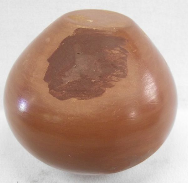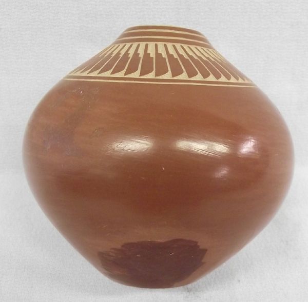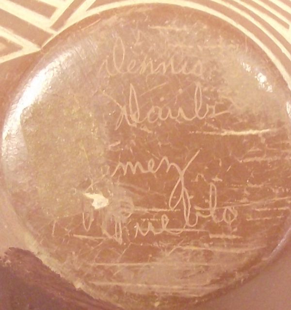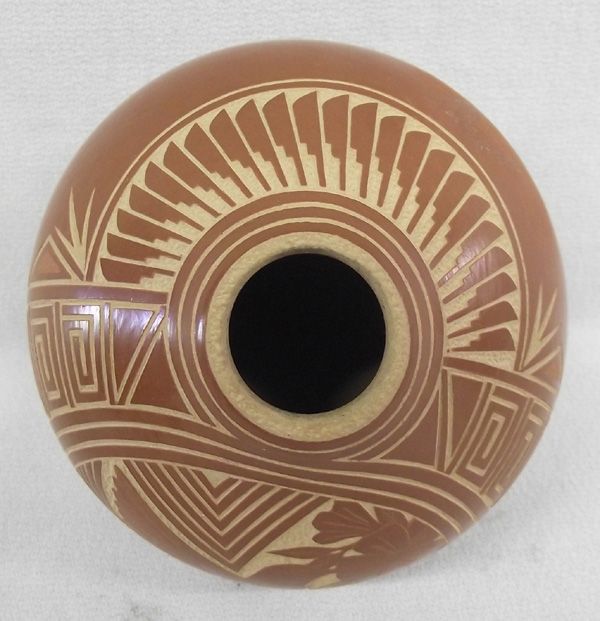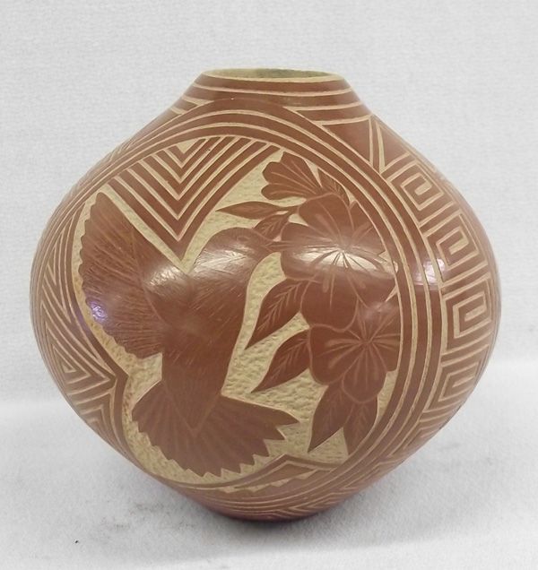 Jemez Sgraffito Jar -- Dennise Daubs, beautifully incised jar depicting hummingbird feeding at flowers along with maze and line designs, highly burnished, mahogany in color, inexpertly repaired, measures 3.5''H x 3.5''W