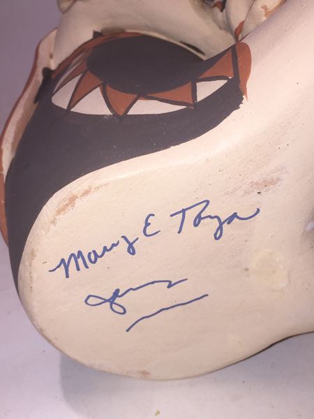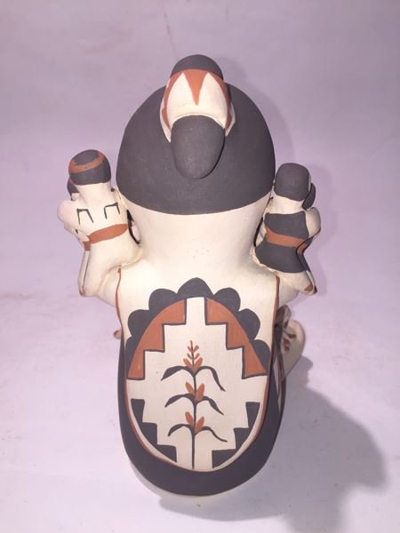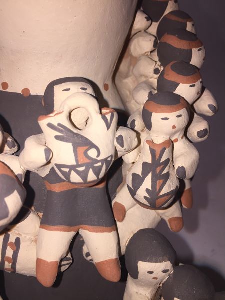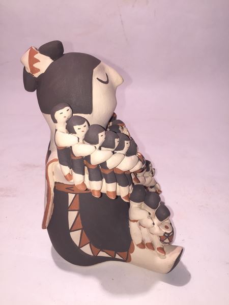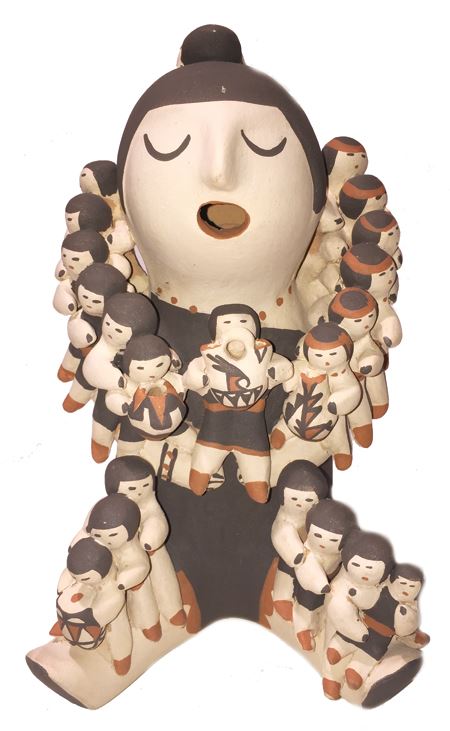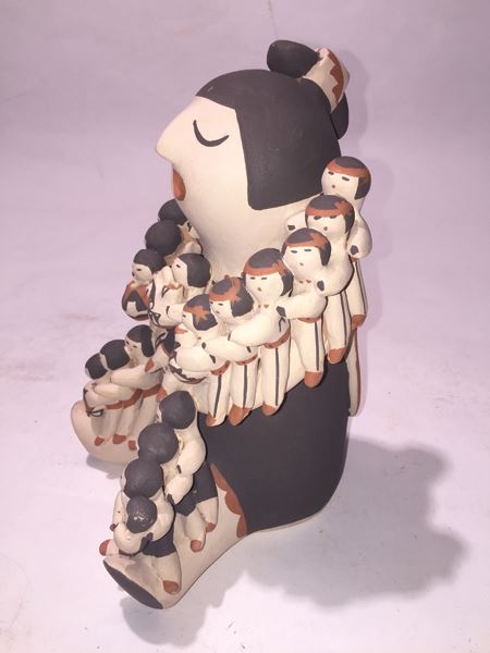 Mid 1900s, Traditional Jemez pottery storyteller with twenty children and babies, some holding drums, pottery, etc. Excellent condition. 8-3/4" x 6" PUB