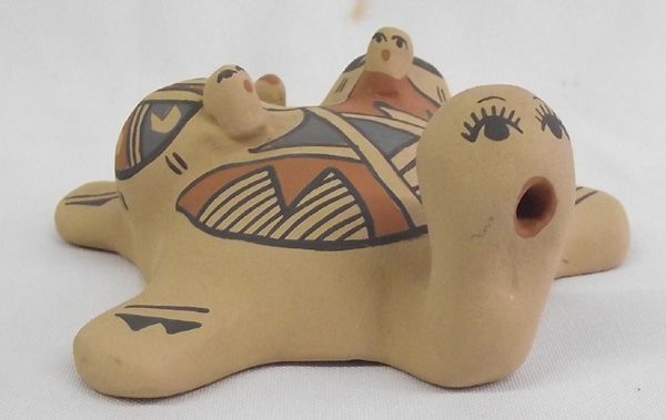 Jemez Storyteller Turtle - Lynette Fragua. Charming mamma turtle with two babes on her back. Painted in red, blue and black on tan. Signed on the bottom, ''Lynette Fragua Jemez Pueblo NM Age 13 yrs.'' Measures 2''H x 5''W.