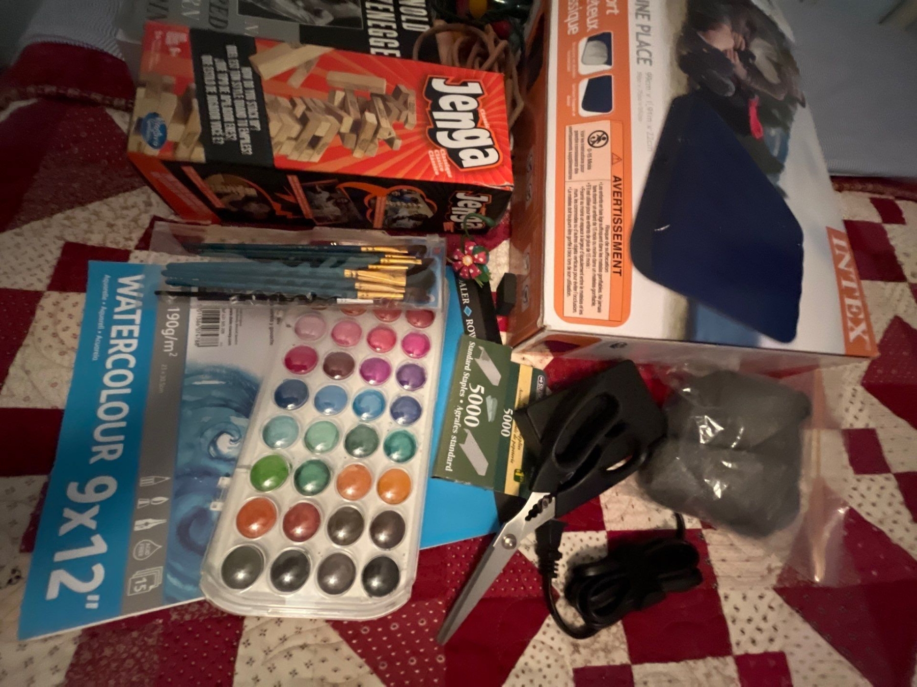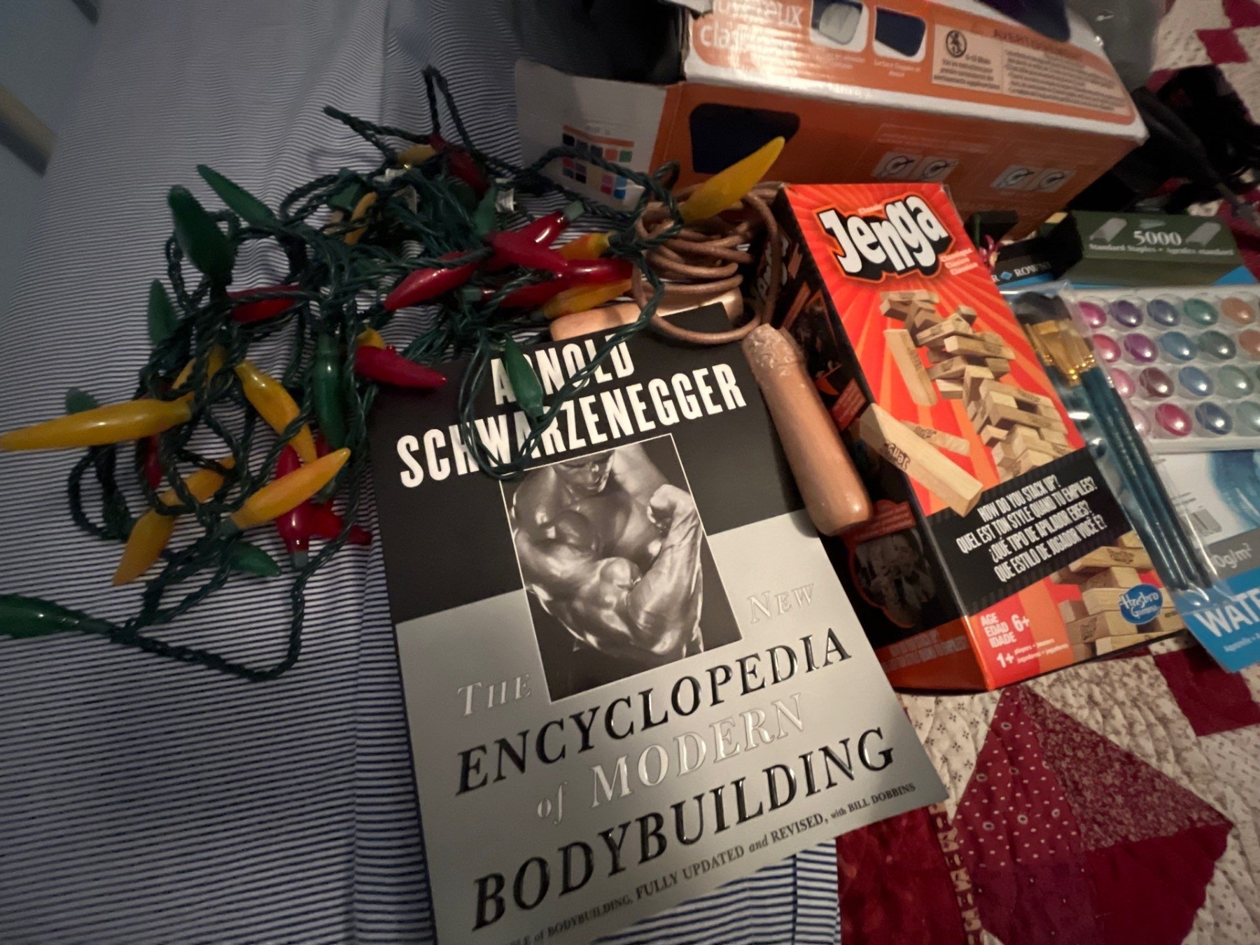 Jenga game with twin classic Downey, blowup mattress, chilli pepper, Lights, Arnold Schwarzenegger, and encyclopedia of modern bodybuilding and art supplies