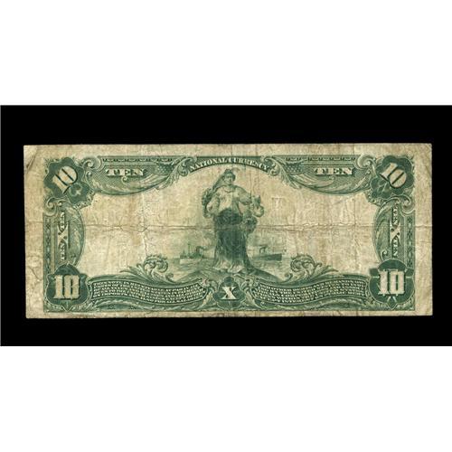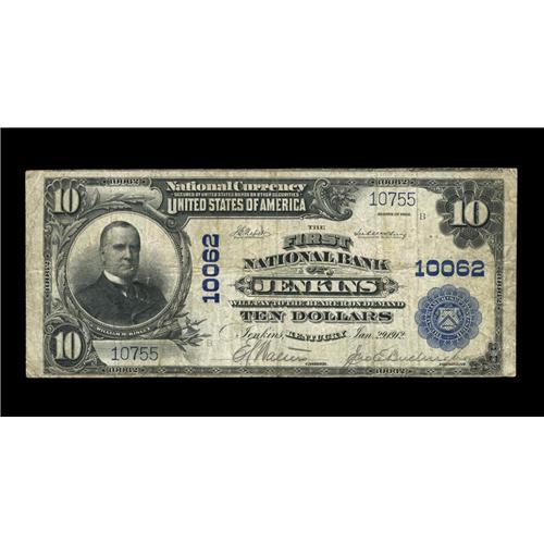 <B>Jenkins, KY</B></I> - $10 1902 Plain Back Fr. 628 <B>The First NB</B></I> Ch. # 10062<BR>This community started life as a company town built by the Consolidated Coal Company in 1911. It received its name in honor of George C. Jenkins, a company director. With the exception of one uncut sheet, all of the large notes from here are in this grade or worse. <B>Fine.</B></I>