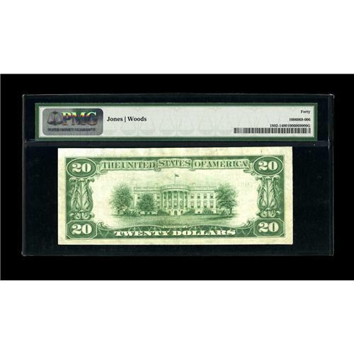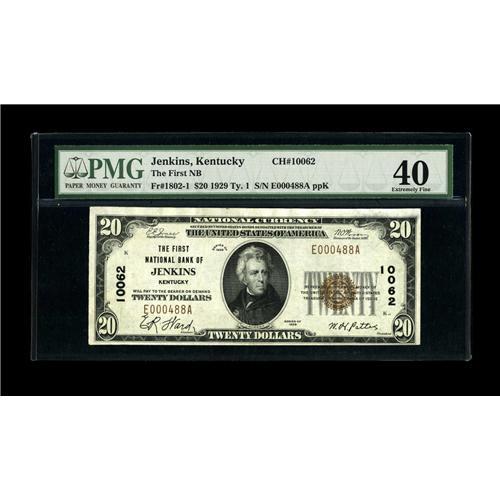 <B>Jenkins, KY</B></I> - $20 1929 Ty. 1 <B>The Jenkins NB</B></I> Ch. # 10062<BR>A $20 note from this locale has graced our auctions only once before. This bright example is graded <B>Extremely Fine 40</B></I> by PMG.<BR><BR><b>Shipping:</b> Coin/Currency (<a target="_blank" href="http://www.heritageauctions.com/common/shipping.php">view shipping information</a>)