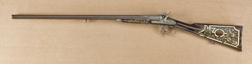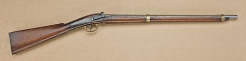 Jenks .54 caliber percussion “mule-ear” carbine made by N. P. Ames, Springfield, Mass. 24-1/2” round barrel, .54 caliber smoothbore with brass mounts. Shows round loading aperture at breech, refer Flayderman 9B-061. The metal surfaces show a light grey to brown patina finish with some traces of case hardening mixed into the lock, some scattered erosion and pinprick pitting. The stock is good with a compression crack in front of the locks and slight loss of wood in that area, otherwise stock is good with traces of inspector’s cartouche. The butt shows small dings and mars. The action is good, the bore is fair to good. The lever, which activates the plunger is marked “21” and “20” on the inside. Few of the Jenks are known with the round loading port and are of premium value to collectors. From an old northeast collection where it has been since long before WWII. Est: $2,000 - $4,000