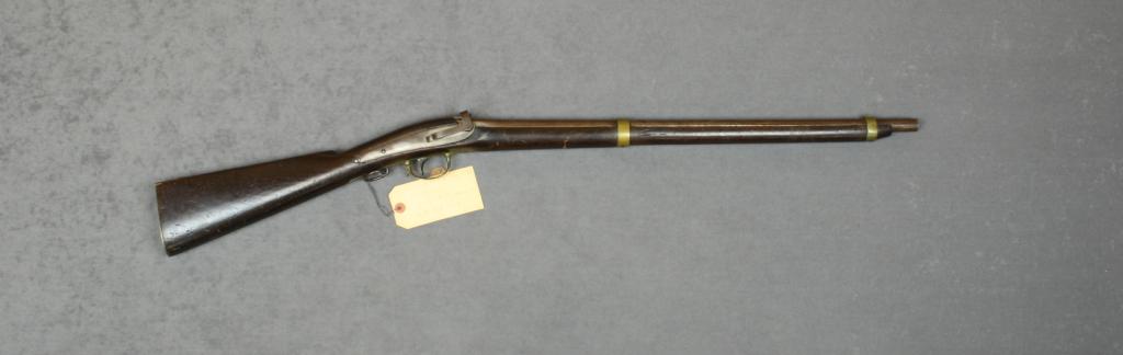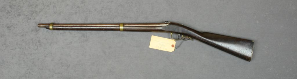 Jenks “Mule Ear” percussion SRC, .54 cal.,  24” round barrel, two brass barrel bands,  brass trigger guard and brass butt plate,  brown finish, full length wood stock, #NVSN.   This gun is in overall good to very goodcondition showing a brown patina on the  barrel and a light grey patina on the lock  plate; clear markings, “U.S.N.” marking on  top of breech with JCB and P markings and  1842 date; the bore is very good, the actiondoes not stay on full cock, the wood is  overall good with scattered old nicks and  mars from carry and storage; about 4,250  manufactured between 1843 and 1846 and the  only mule-ear type arm officially accepted by the U.S. armed forces.  Est.:   $1,200-$2,400.