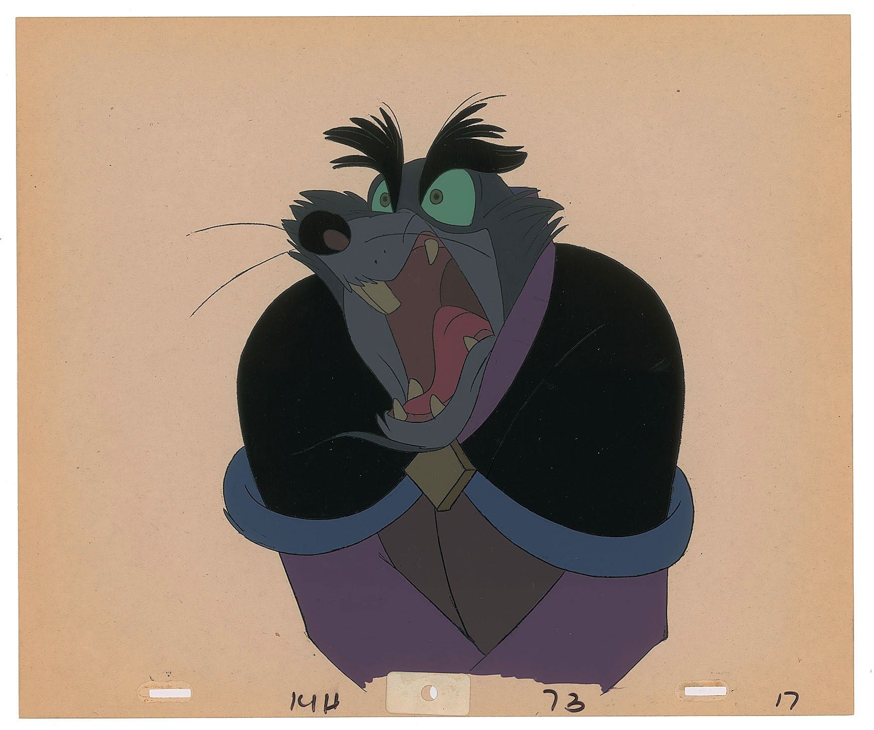 (Don Bluth Productions, 1982) Original production cel featuring Jenner from The Secret of NIMH, showing the ruthless rat screaming in pain. Image measures 7.5 x 8.75, with overall dimensions of 12.5 x 10.5, and marked in the lower border, "14H, 73, 17." In fine condition. An excellent portrayal of the film's memorable villain.