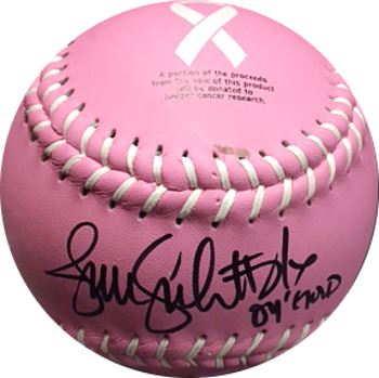 Jennie Finch pitched for the USA national softball team and won the gold medal at the 2004 Summer Olympics and a silver medal at the 2008 Summer Olympics. Although she is listed on the roster as a pitcher, Finch sometimes plays first base. She is regarded as the most famous softball player in history. Jennie Finch has hand autographed this Official Baden Lexum 12 inch Pink Breast Cancer Awareness Logo Softball with 04 Gold inscription. MAB Hologram and Certificate of Authenticity from Athlon Sports.