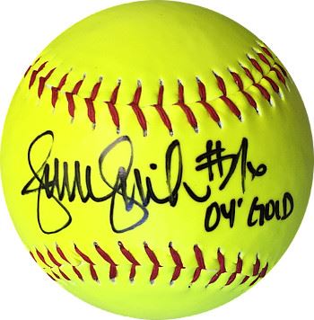 Jennie Finch pitched for the USA national softball team and won the gold medal at the 2004 Summer Olympics and a silver medal at the 2008 Summer Olympics. Although she is listed on the roster as a pitcher, Finch sometimes plays first base. She is regarded as the most famous softball player in history. Jennie Finch has hand autographed this Official 12 inch Yellow Softball with 04 Gold inscription. MAB Hologram and Certificate of Authenticity from Athlon Sports.