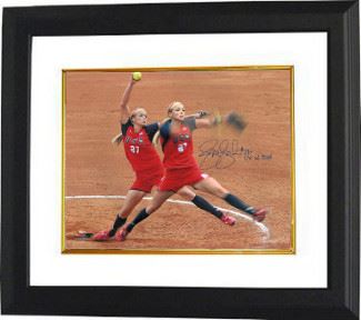 Jennie Finch pitched for the USA national softball team and won the gold medal at the 2004 Summer Olympics and a silver medal at the 2008 Summer Olympics. Although she is listed on the roster as a pitcher, Finch sometimes plays first base. She is regarded as the most famous softball player in history. Jennie Finch has hand autographed this Olympic Team USA 16x20 Color Photo Double Exposure with "04 US Gold" inscription. Certificate of Authenticity from Athlon Sports. Custom White Mat and Premium Black Color Framed as shown.
