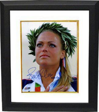 Jennie Finch pitched for the USA national softball team and won the gold medal at the 2004 Summer Olympics and a silver medal at the 2008 Summer Olympics. Although she is listed on the roster as a pitcher, Finch sometimes plays first base. She is regarded as the most famous softball player in history. Jennie Finch has hand autographed this Olympic Team USA 8x10 Color Photo from the 2004 Olympic Ceremony with "USA Gold" inscription. Photo of the signing and Certificate of Authenticity from Athlon Sports. Custom White Mat and Premium Black Frame as shown.