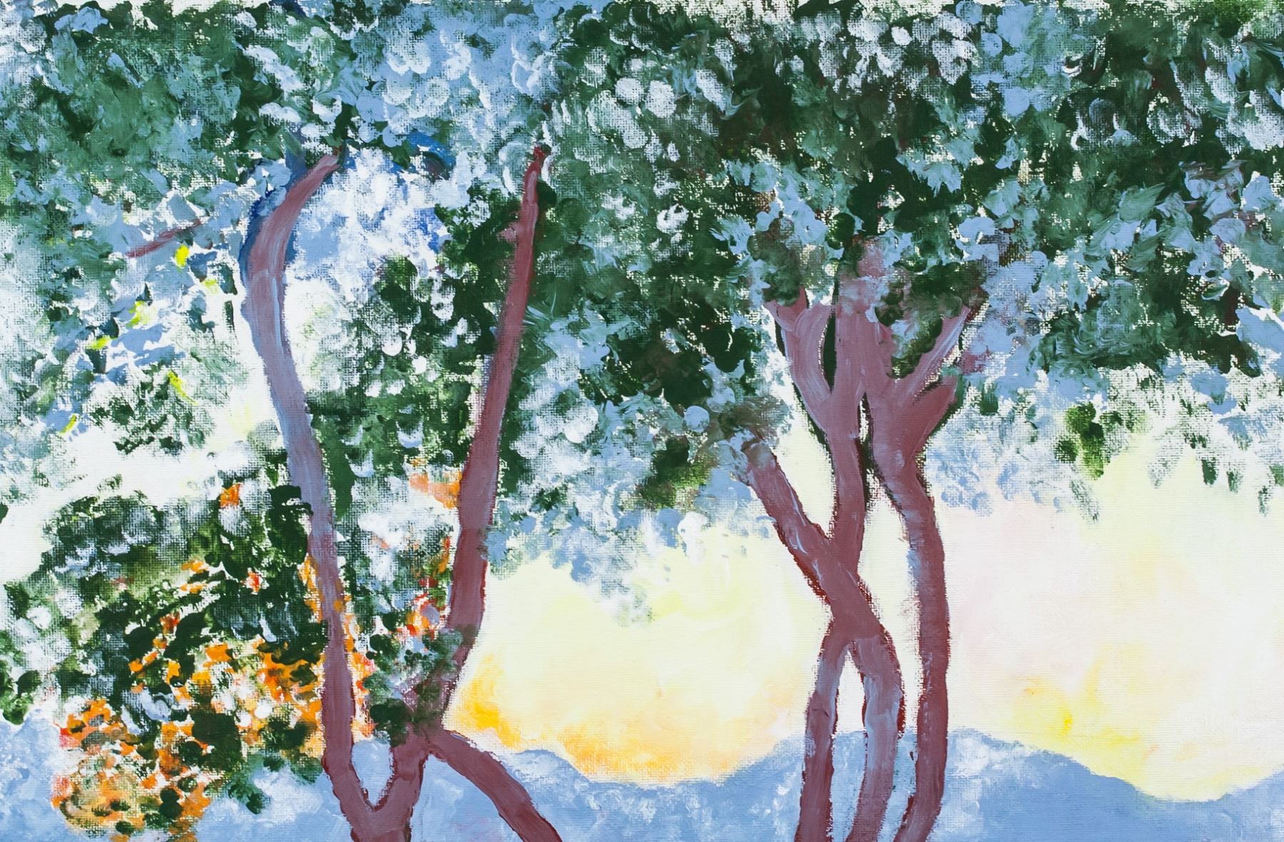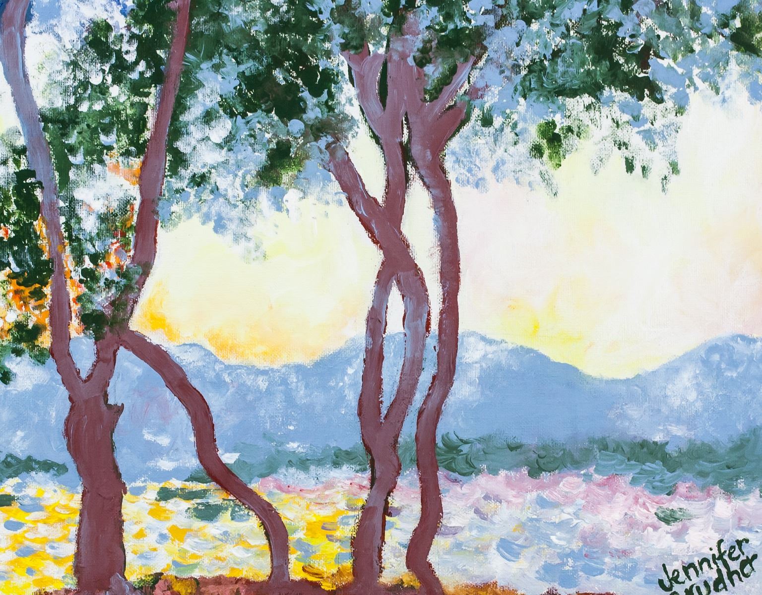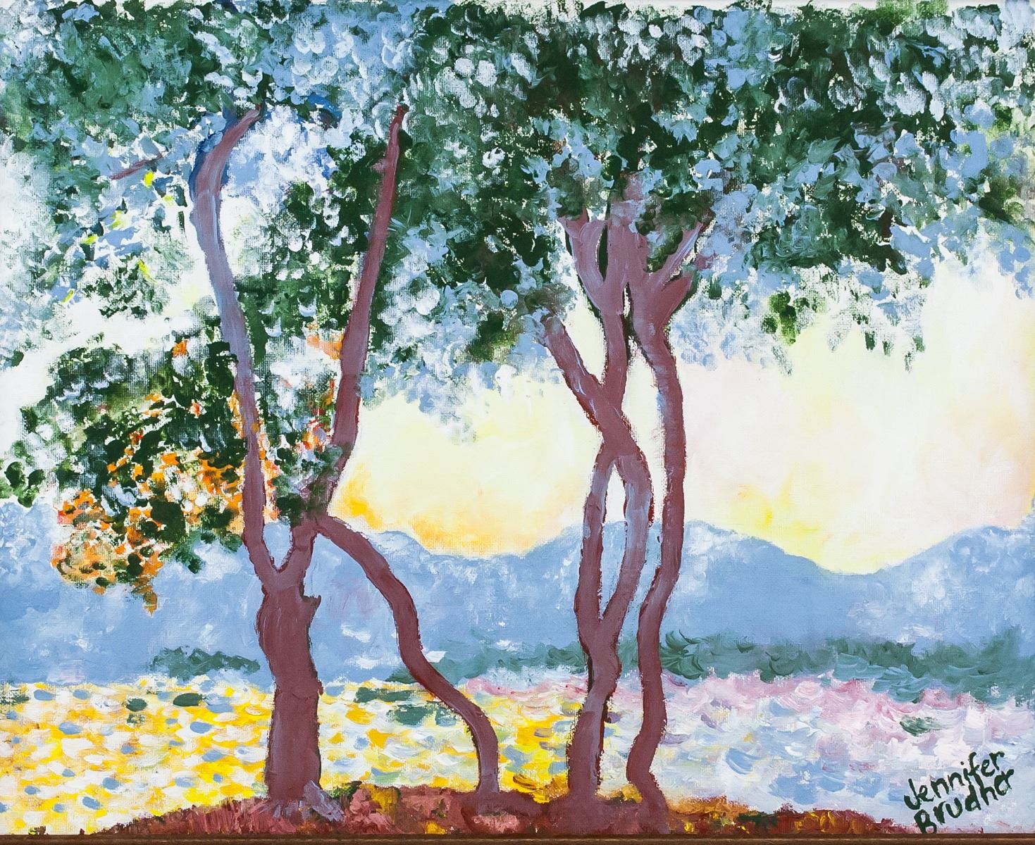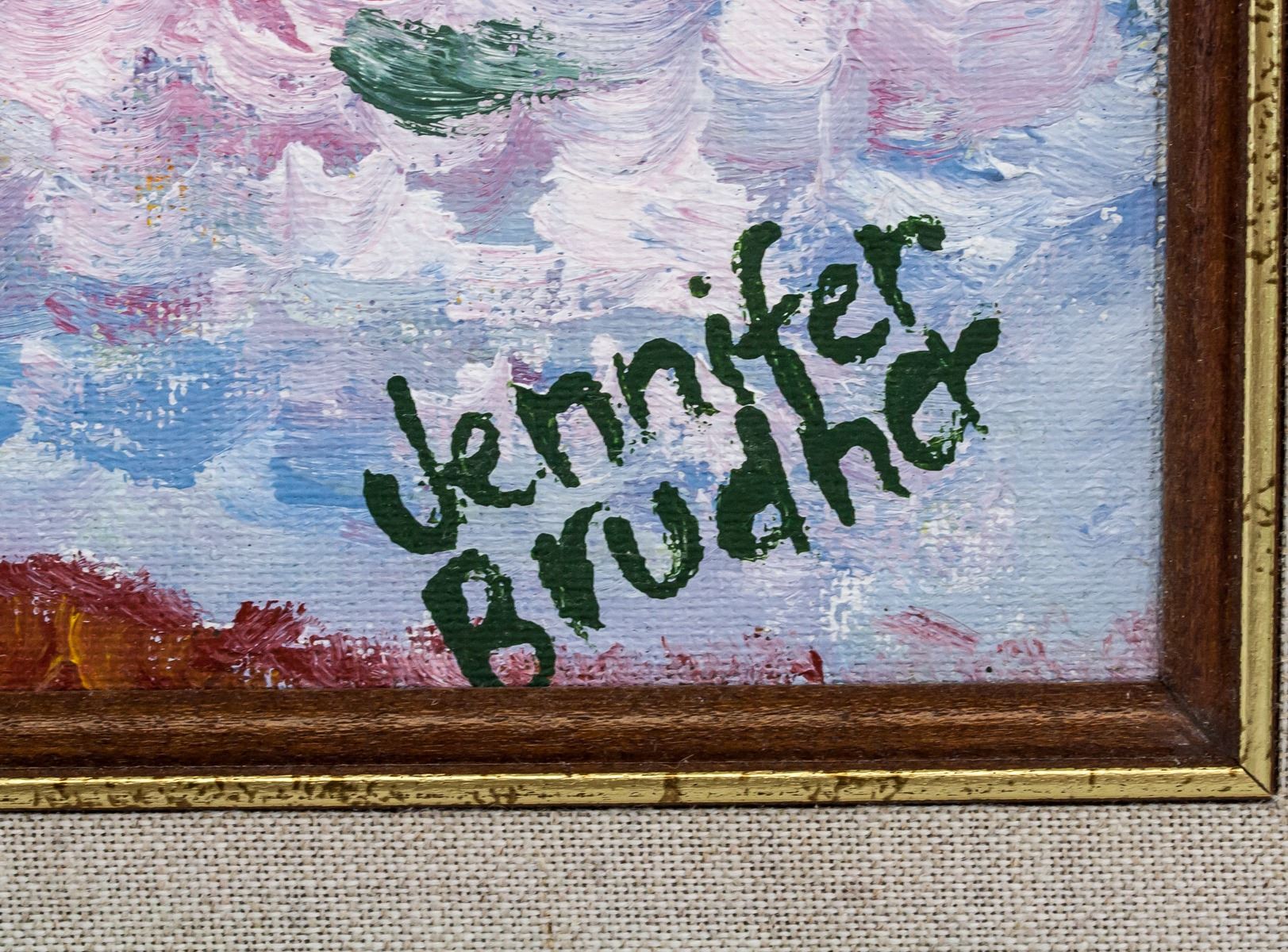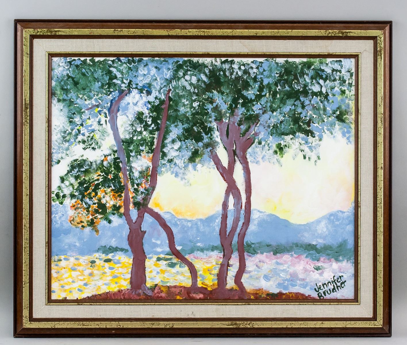 Oil on panel, framed. Featuring landscape scene with two trees in the foreground and mountains in the background. Signed Jennifer Brudher (Canadian) on the bottom right corner. 39.5 x 50 cm (15.5 x 1935 in), Frame: 62 x 53 cm (24.4 x 20.9 in).