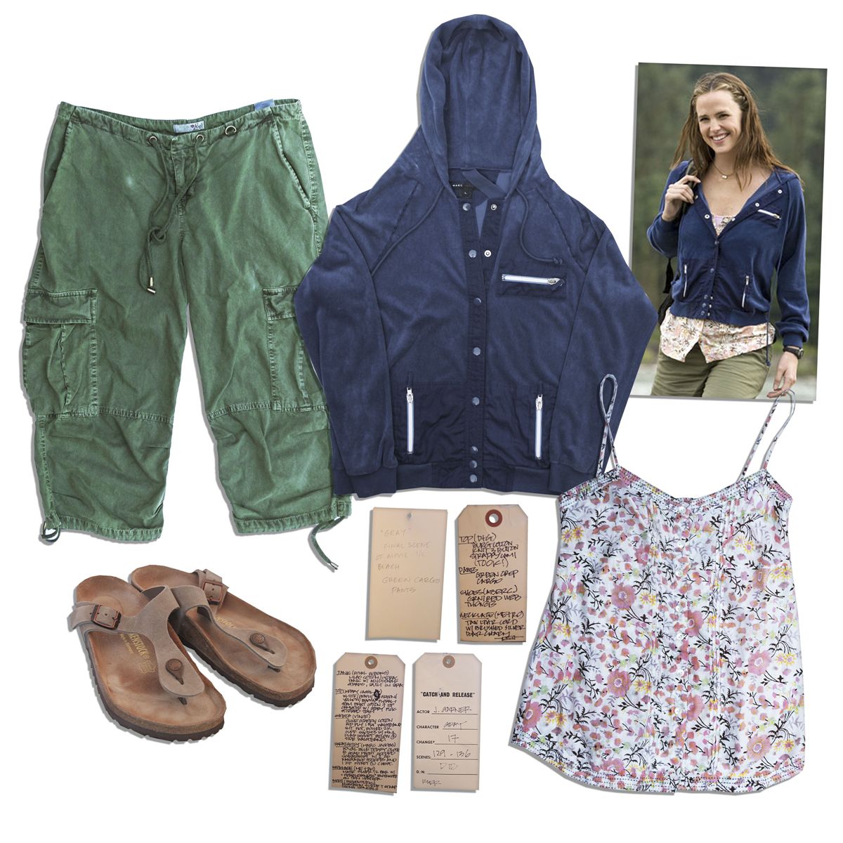 Jennifer Garner worn costume from the 2006 film, ''Catch and Release''. Garner played ''Gray Wheeler'' in the drama, which follows a budding romance after her husband passes away on their wedding day. Costume includes: (1) A ''Kerry Cassil'' brand peach pastel-colored floral print cotton top, size 3. (2) A navy blue ''Marc Jacobs'' brand hooded sweatshirt, size L. (3) A pair of olive green ''Joie'' khaki capri pants, size 29. (4) A pair of tan suede Birkenstock sandals, size 38. Near fine. With the Columbia Pictures wardrobe tag and a color photocopy of the COA from Columbia Pictures, describing the outfit.